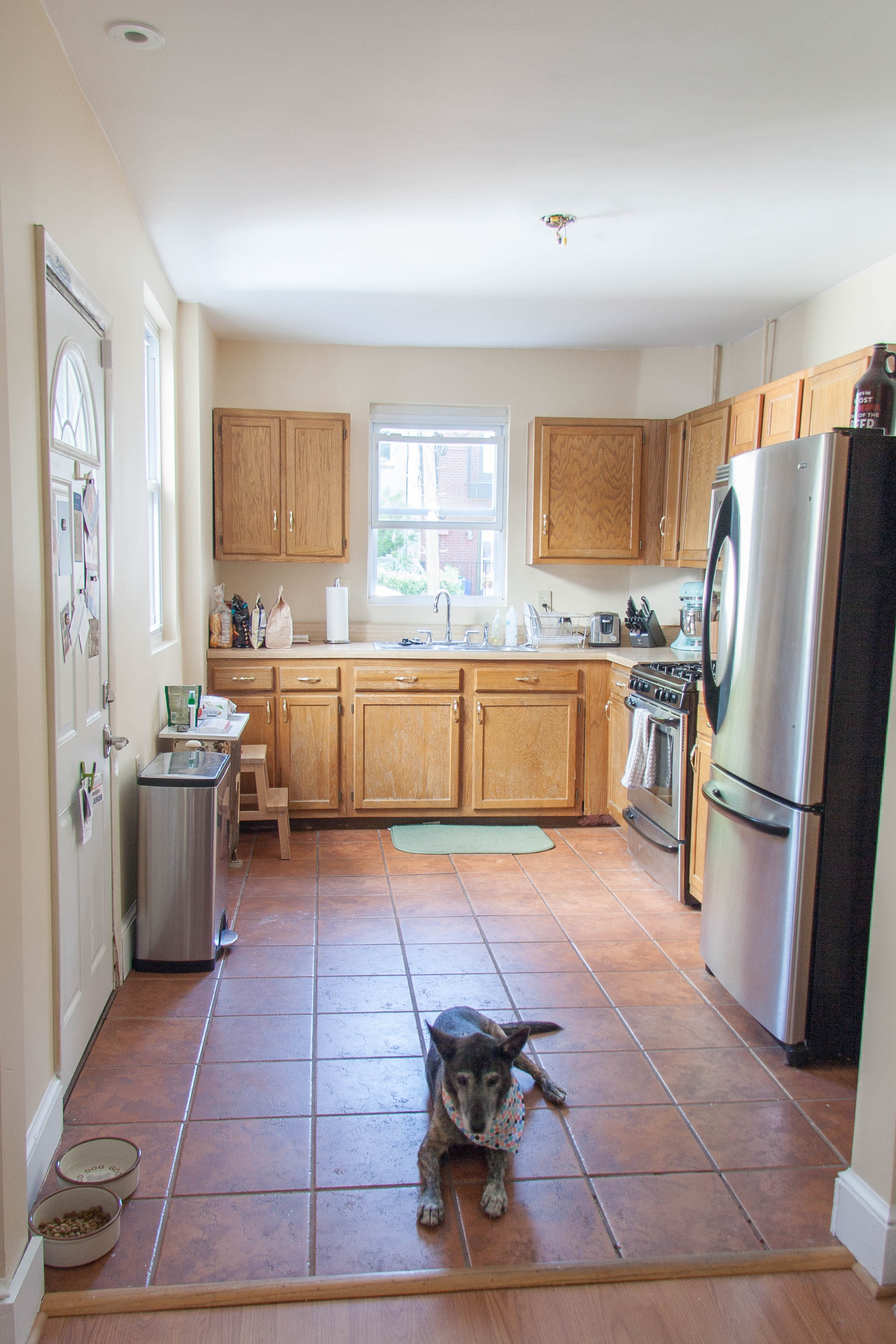 A bit overexposed but…ta da! It really is bright in the kitchen now and feels more modern. Also, note the cute doggy guest, Evey, who clearly approves of the new paint color. (We dog sat shortly after painting the kitchen).