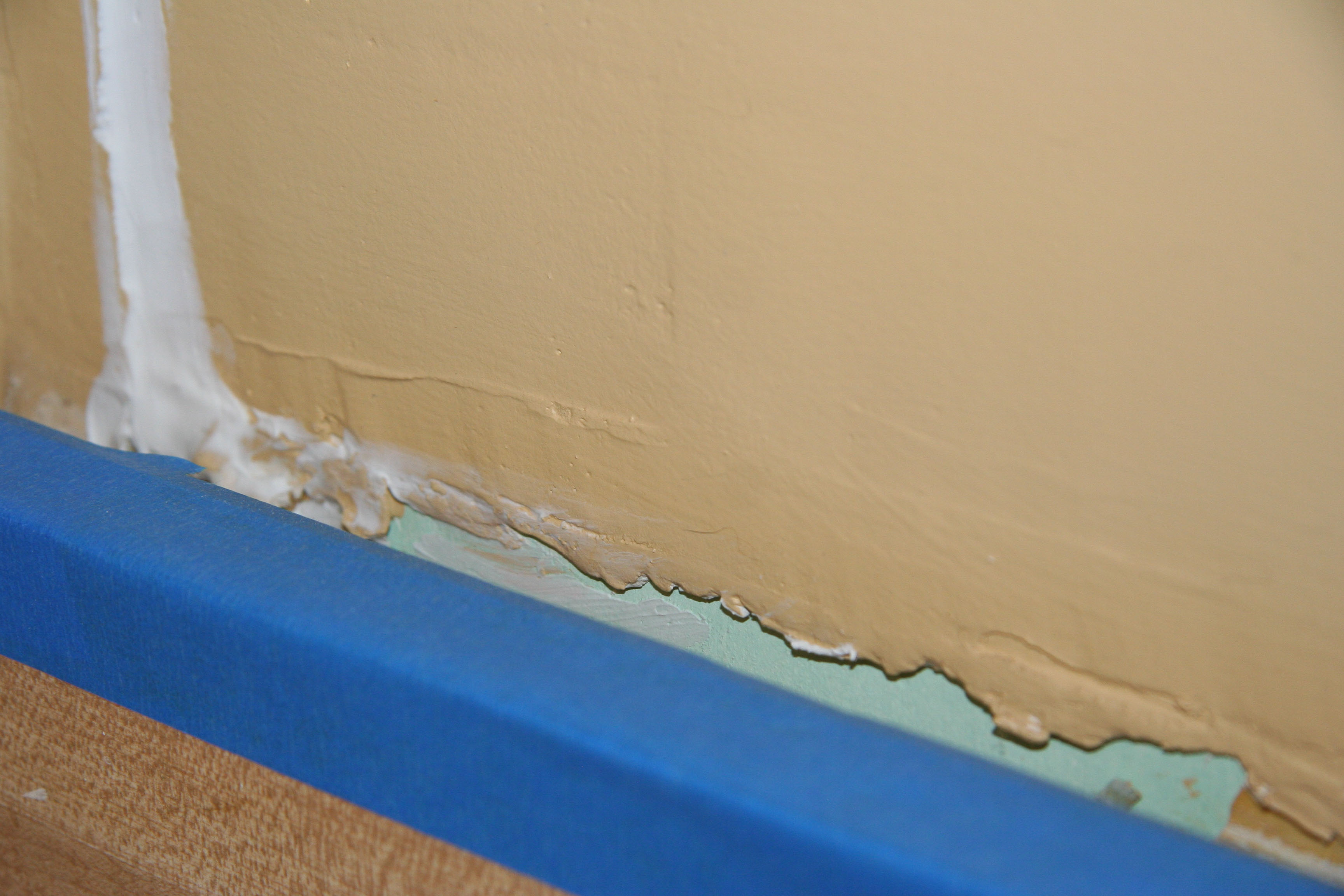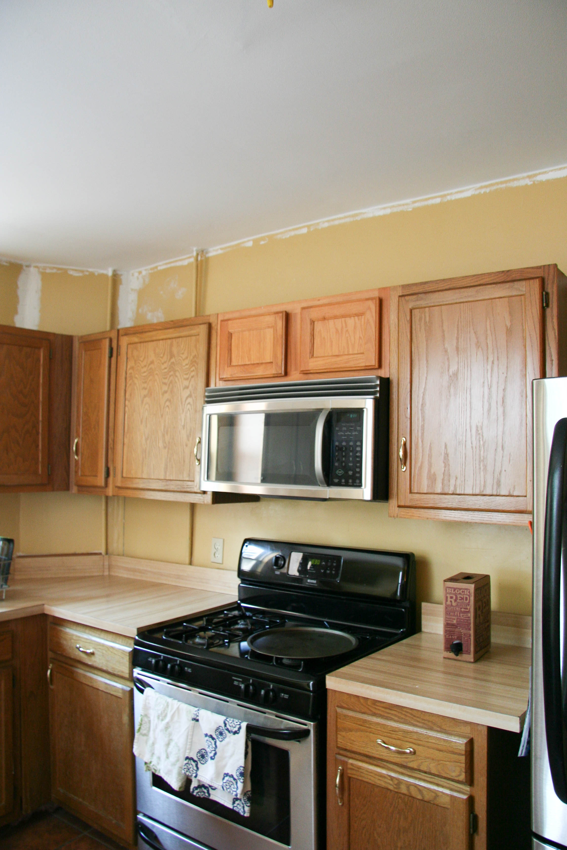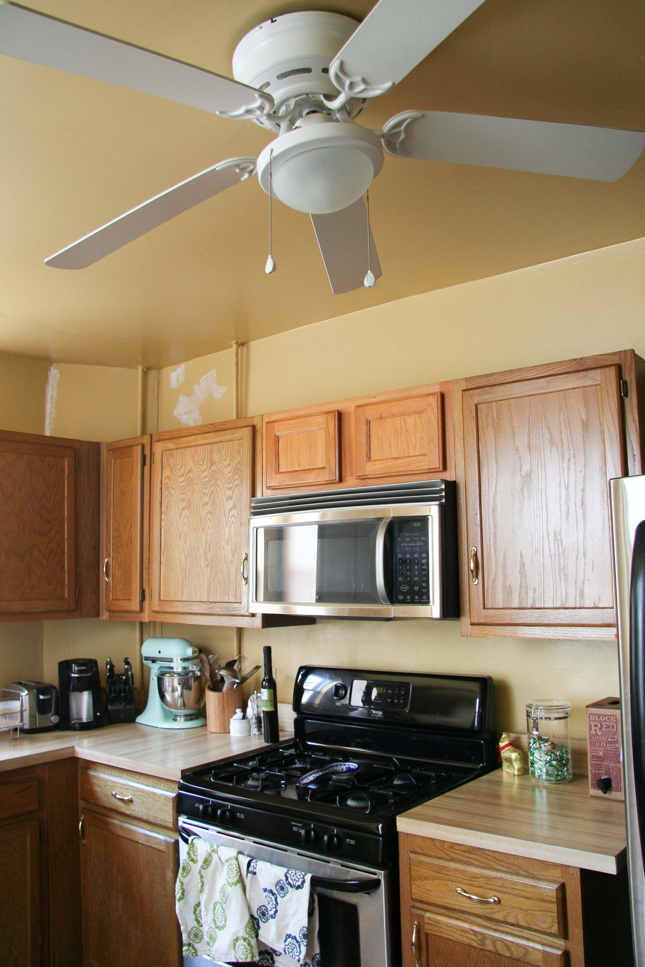 Since we moved in, the kitchen had been the same mustard color that it was when we bought the house. Mike had done some patch work when we first moved in, when we had intended to paint it immediately after move in, but then we got lazy so the kitchen looked particularly neglected. You can see below that we had even prepped the AC vents with painters tape…and it had sat prepped like that for 6 months.