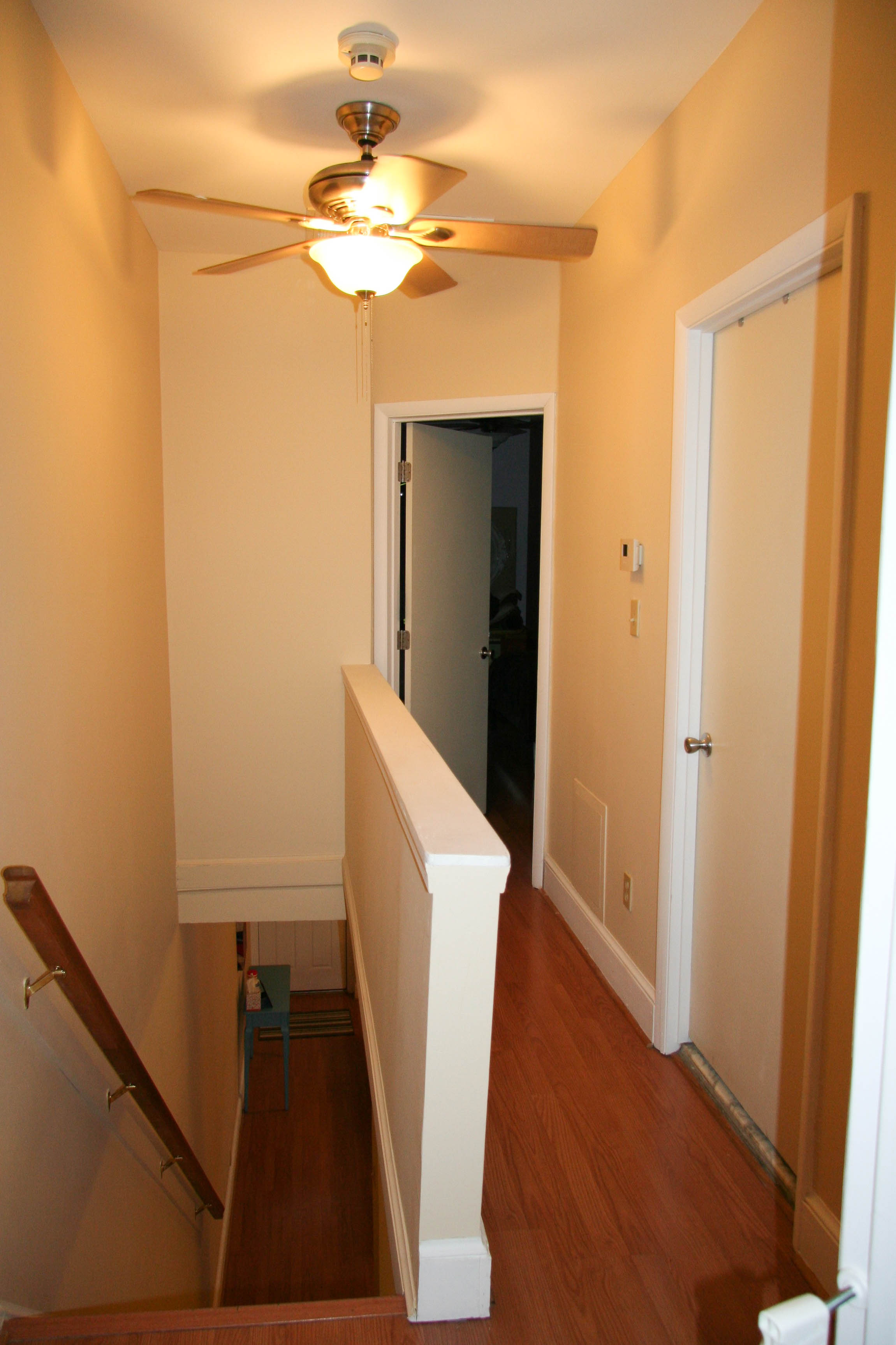 Since so much is being done on the second floor already, we decided to replace the floor as well! The stairs are oak, but the rest of the second floor is laminate floor. We’re going to put in some sort of hardwood (actually hoping a decision about what kind today!)