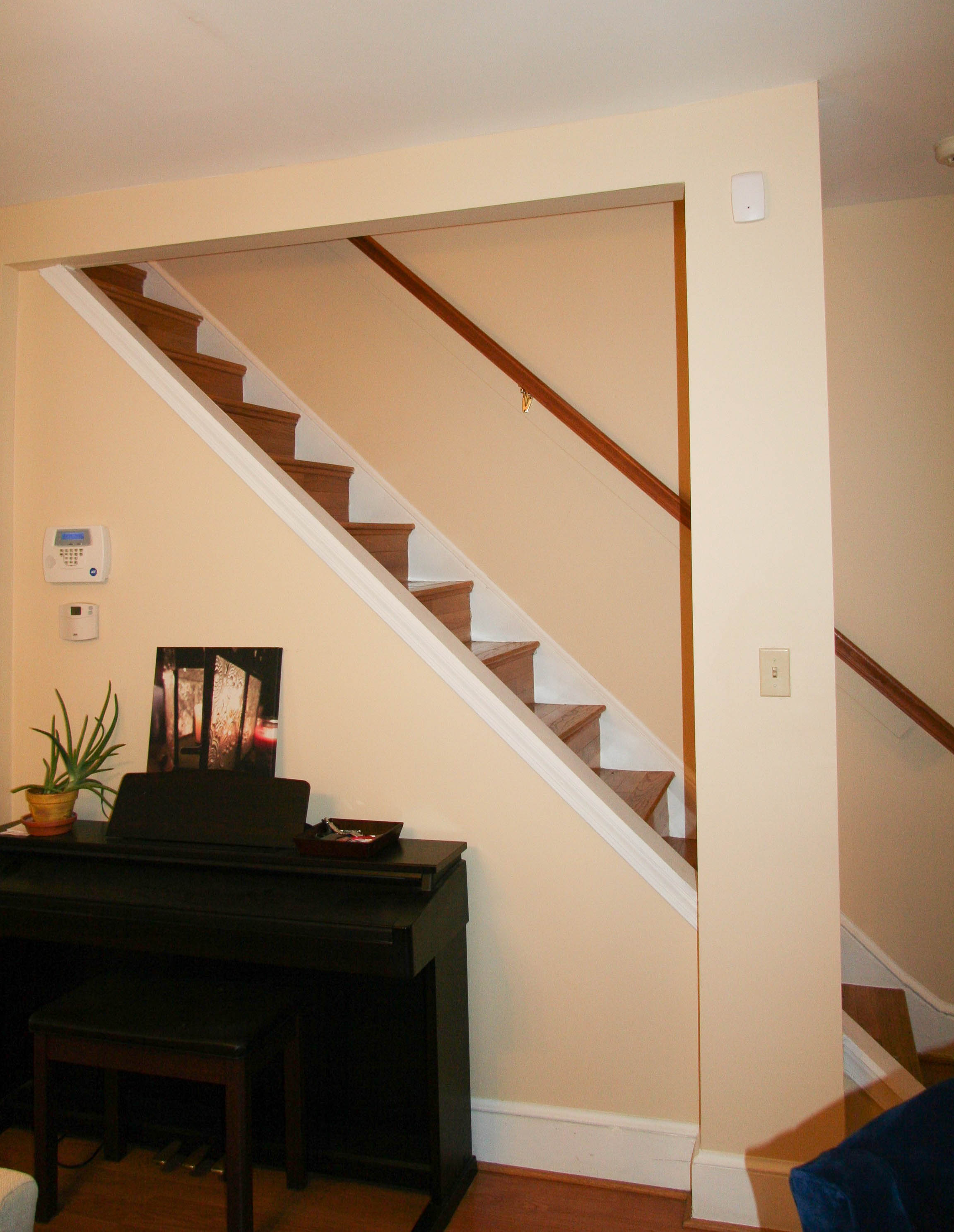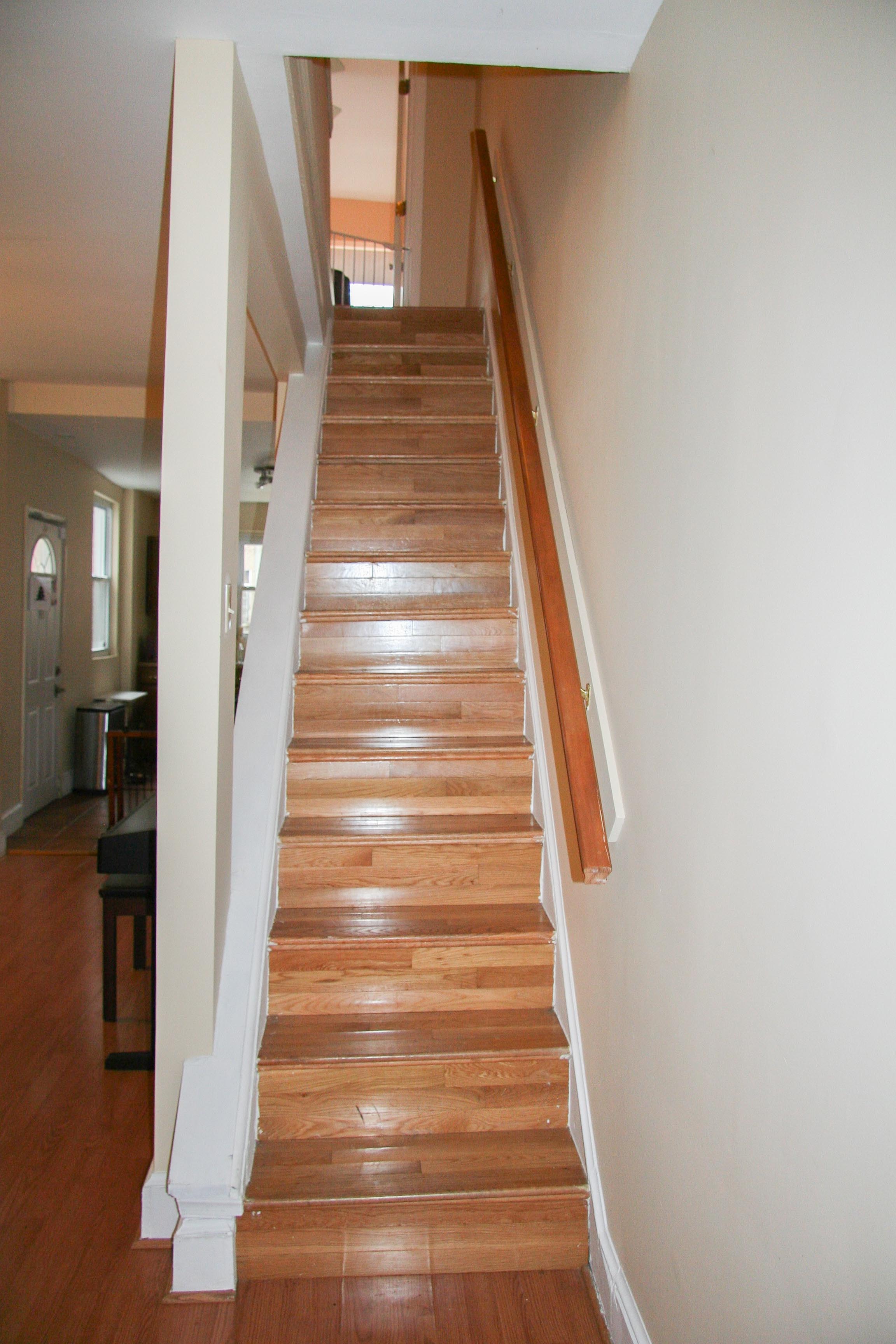 If you have ever been to your house, you probably gripped the stairway railing for dear life going up and down the stairs. None of the treads and risers are even in width nor in height and the stairs have also shifted over time so they are also slightly sloped. On top of that, we are missing a balustrade on the left side so if you do slip, you can fall right through that opening!