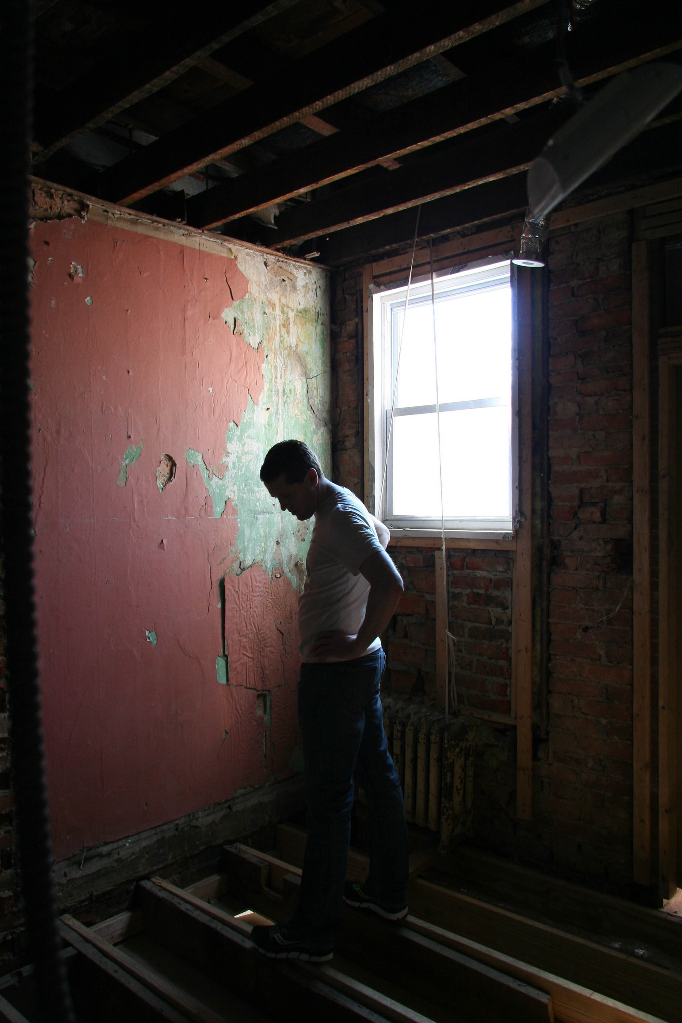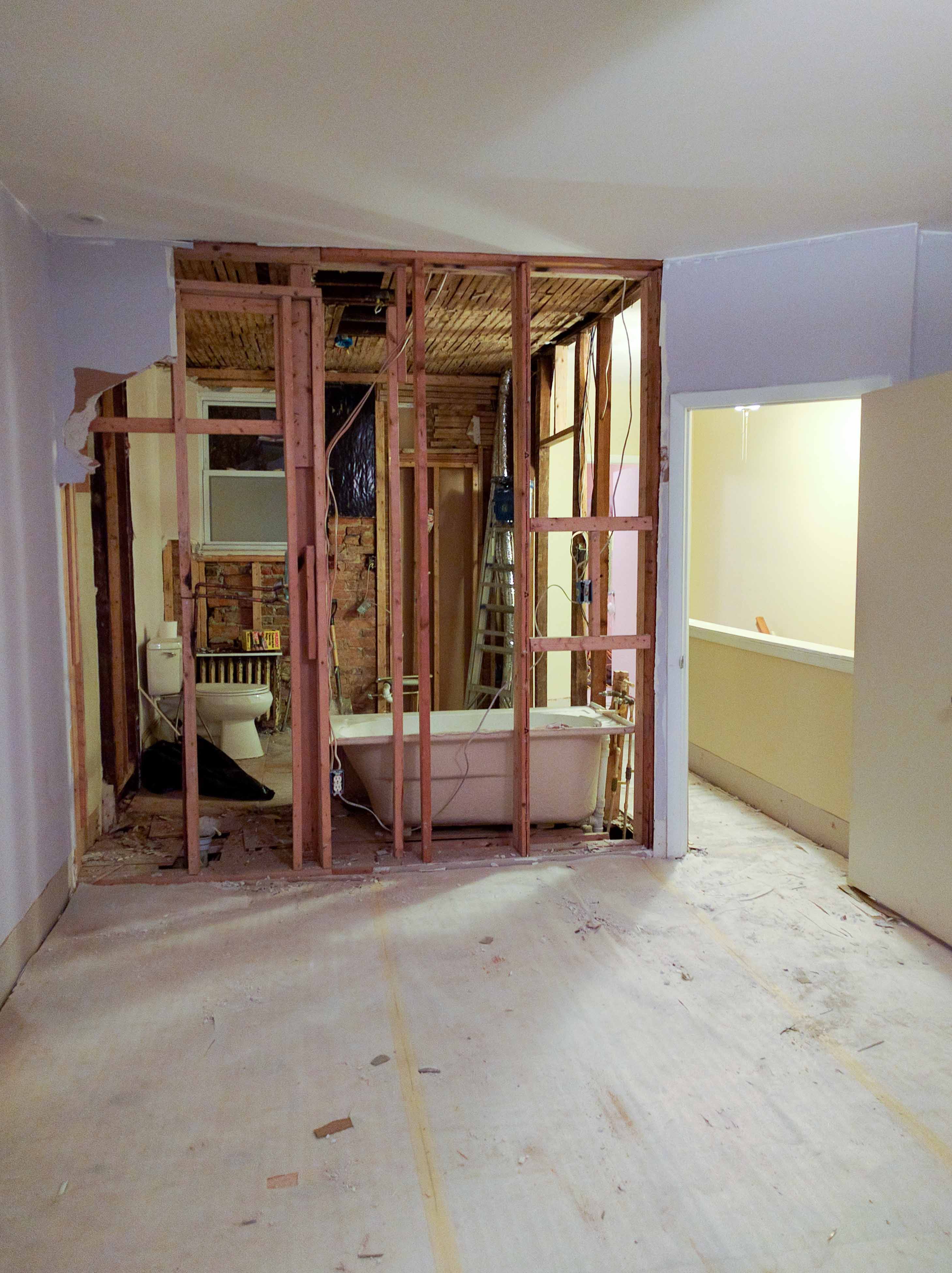 In the pic below, you can make out where the linen closet will be. The lavender wall on the right behind the frame was the old bedroom wall - that will now be the hallway closet.