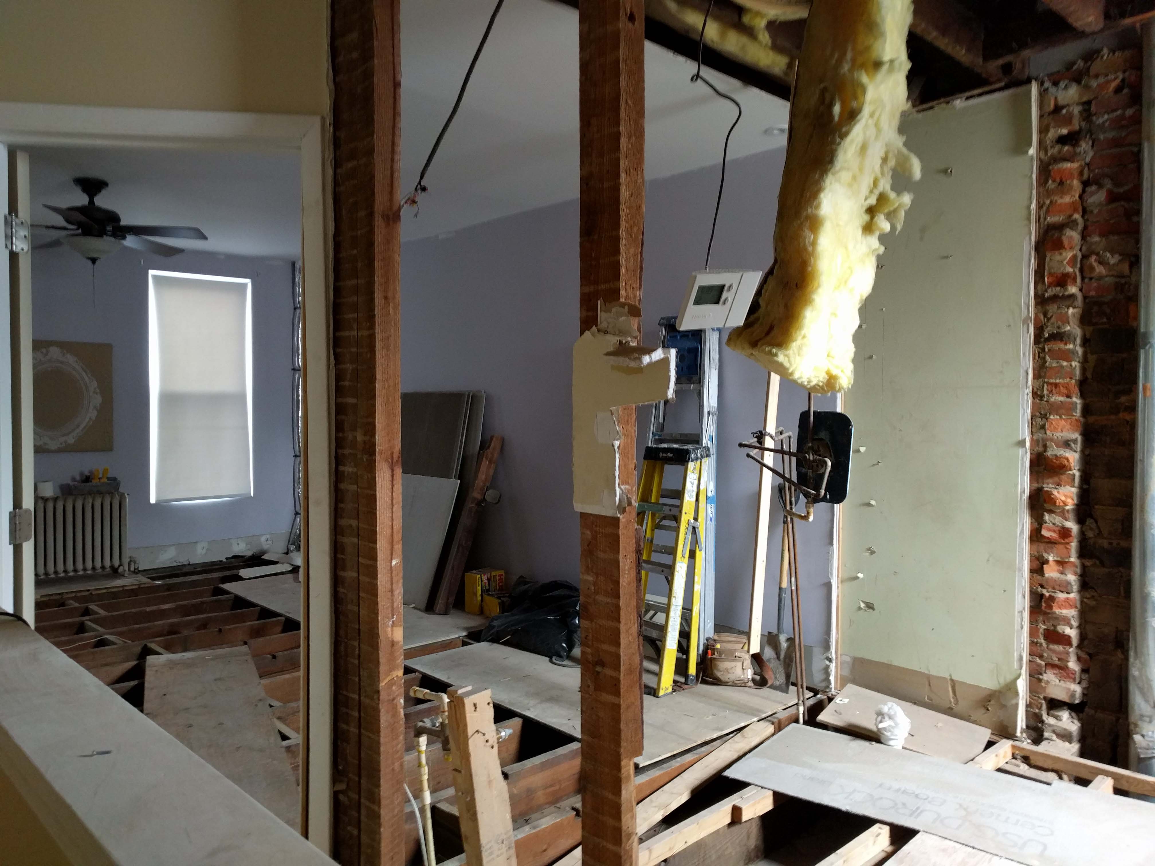 Then the sub floor came up and you could see the floor joists. This was also the first view of the demo when it finally hit me that we really were tearing up the place. Seeing your theromstat just dangling on a wire really sends the point home: