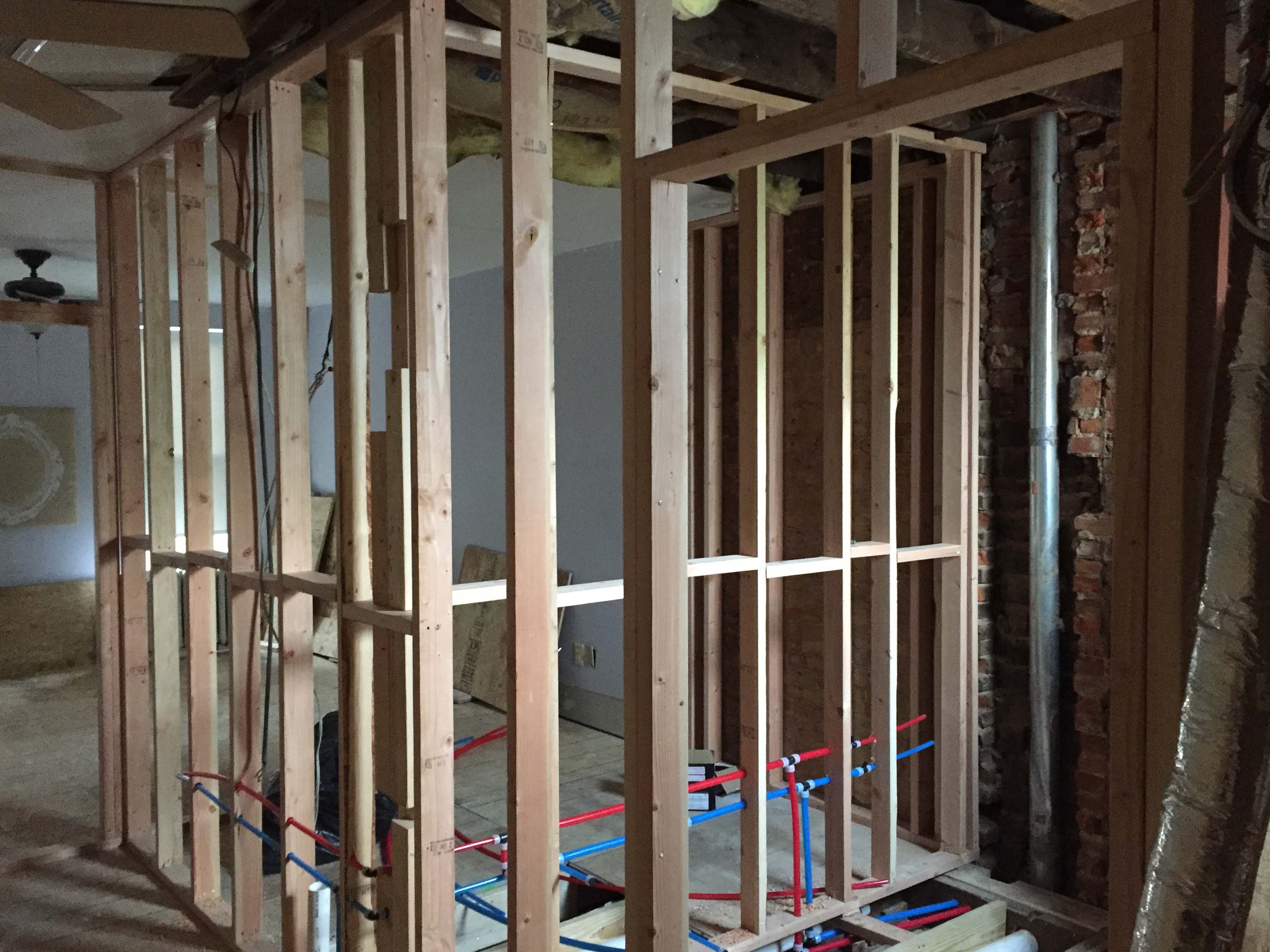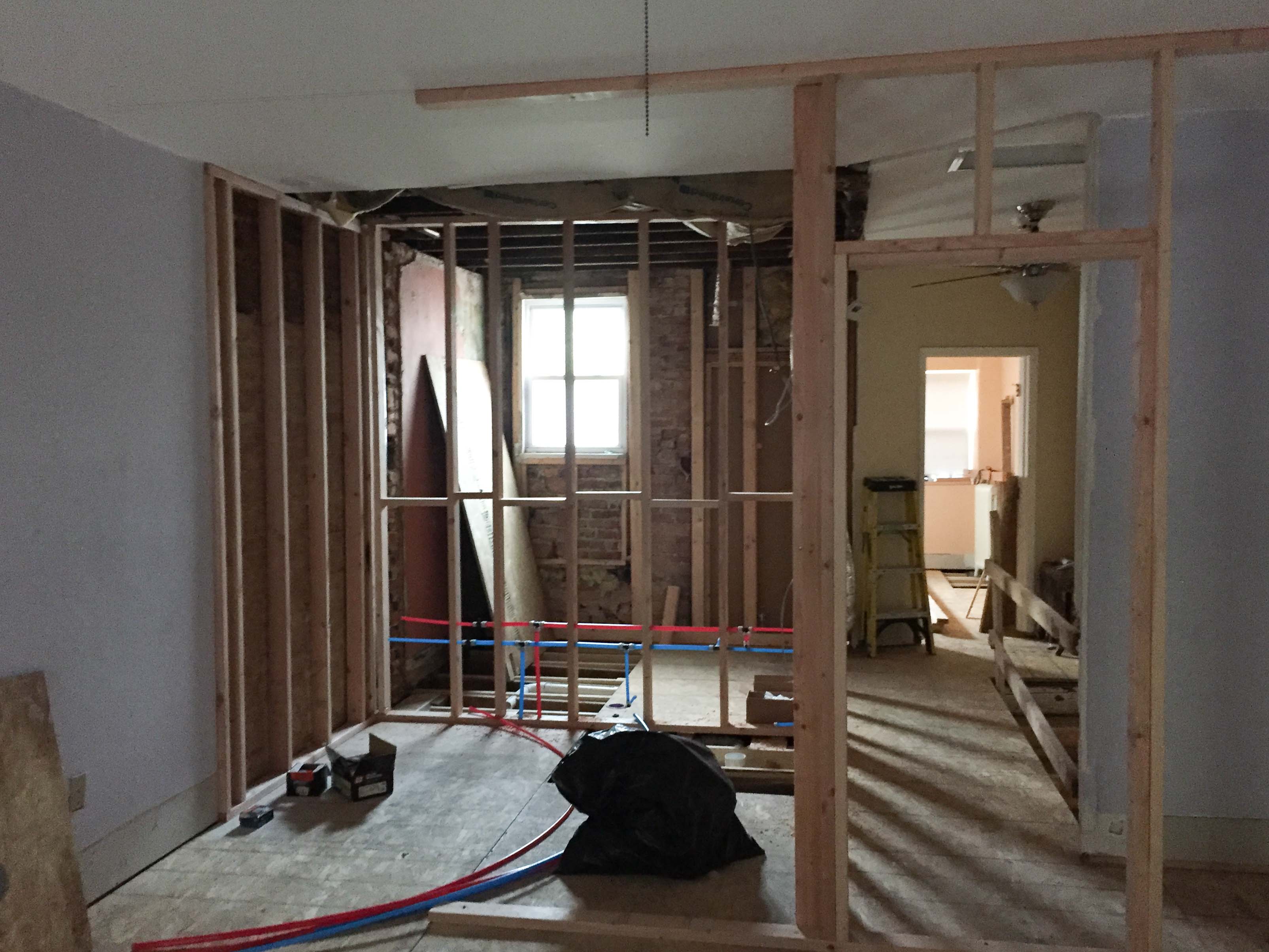 And with that, demo was over. Now on to framing out the new layout! You can see the bathrooms taking shape and our new color coded plumbing. So pretty.