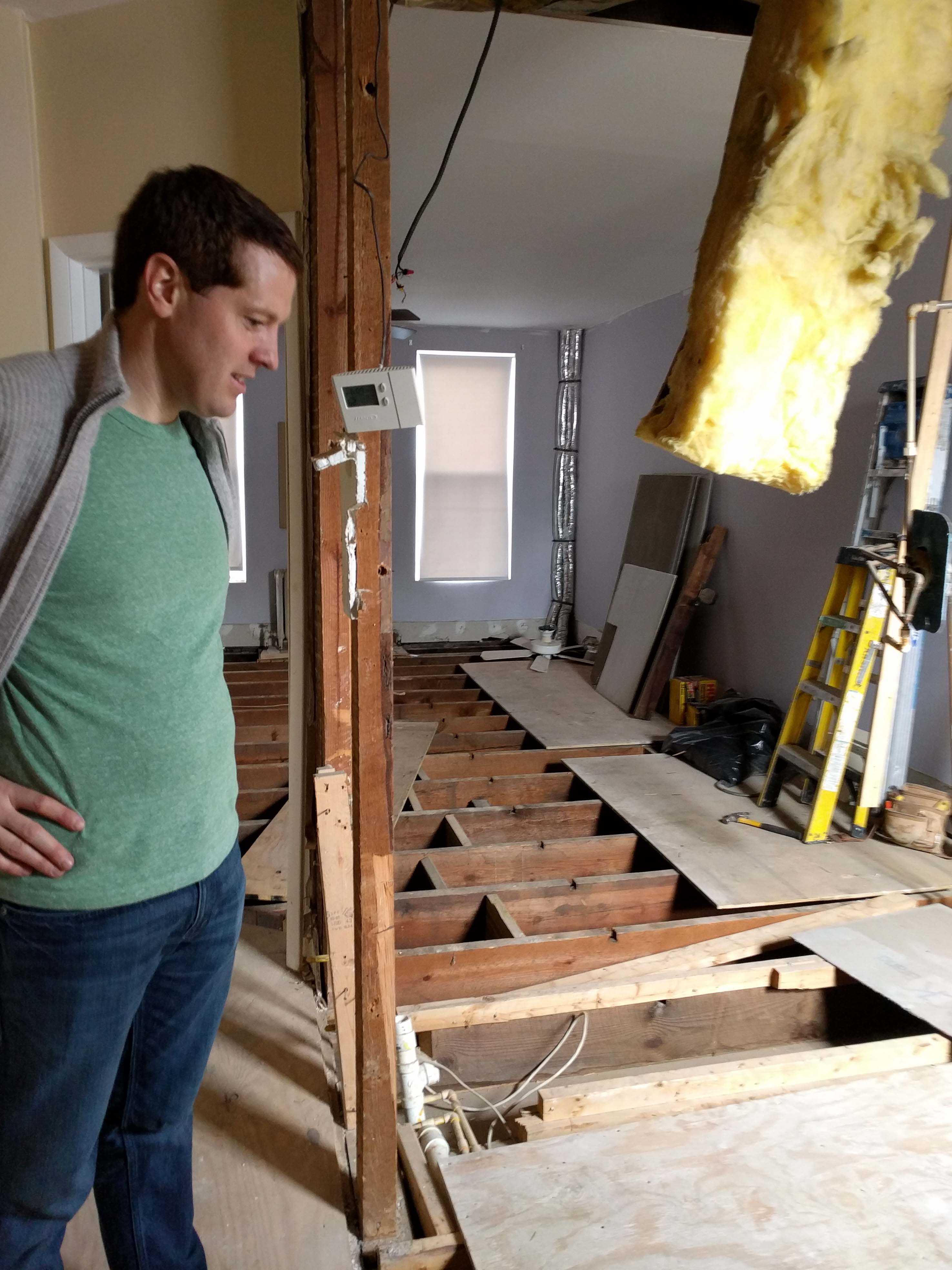 And this is about when we had our first surprise! Let’s just say that the old owner must have had some shady folks come in to do some work. Apparently, they ran the pipes under the floor by cutting holes into the floor joists and they did that allll the way through to the back bedroom - through every single floor joist. Essentially they compromised the stability of nearly the entire second floor. Our contractor Peter actually said, and this is an exact quote: