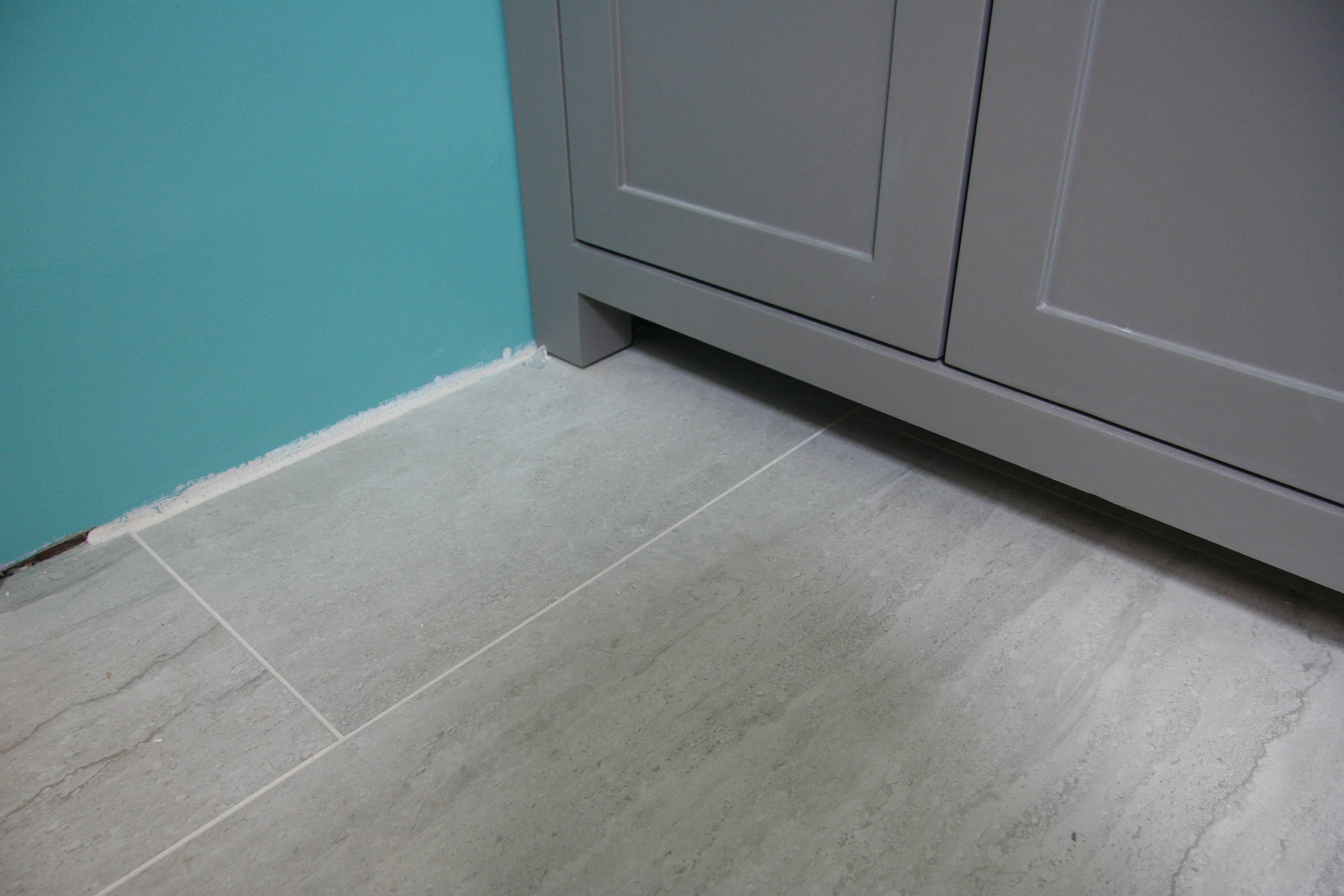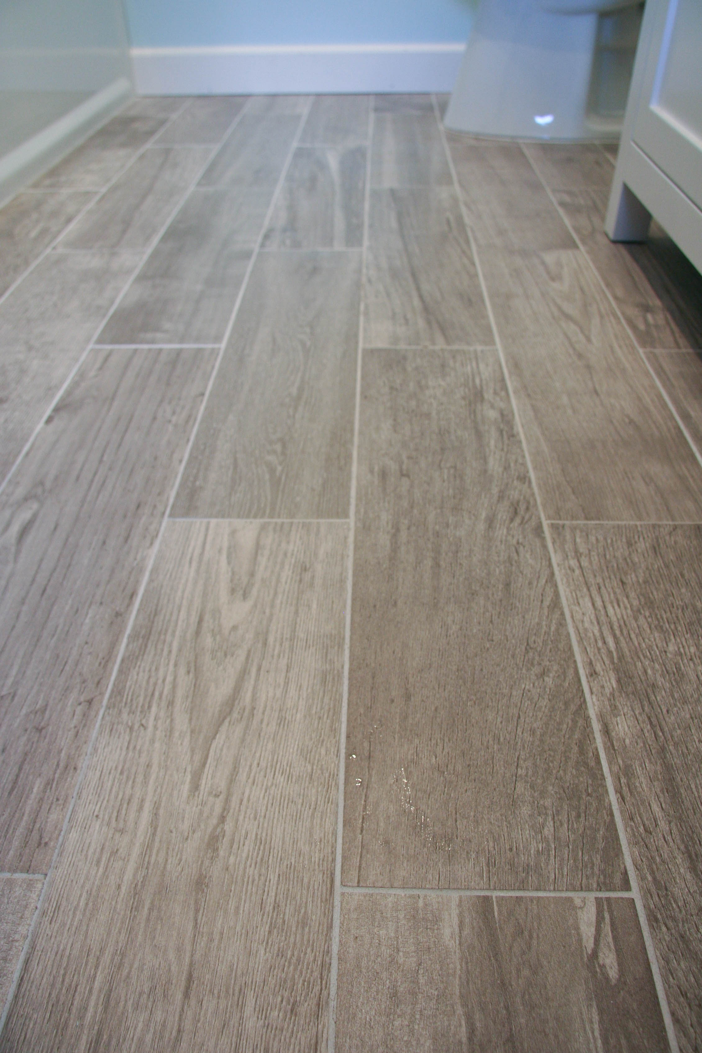 The floor is porcelain wood grain gray tiles. Hopefully this trend will still be current in a few years. The texture of the tiles makes it non-slip too, a useful bonus!