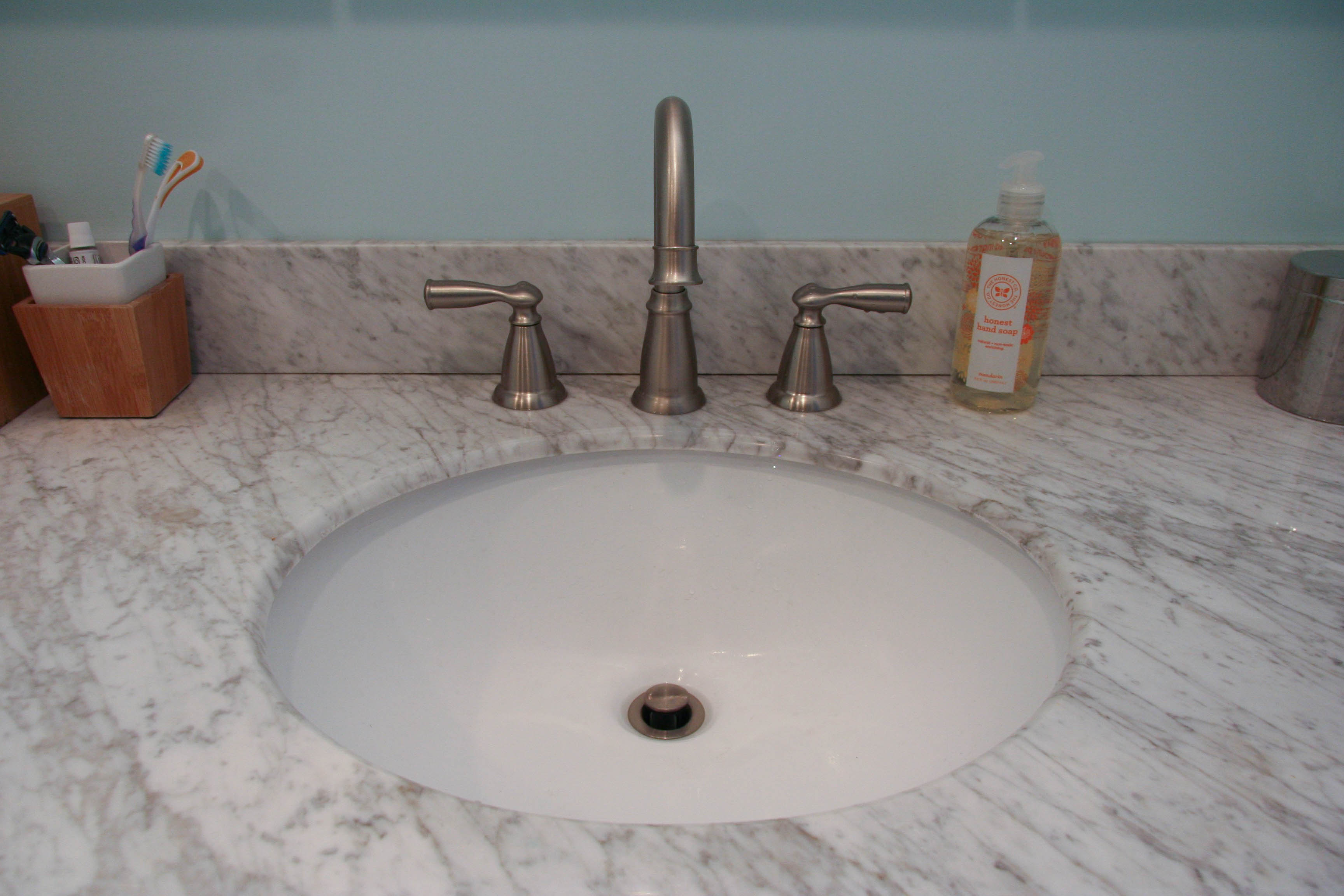 A close up view of our sink with brushed nickel fixtures. Mike loves brushed nickel. Looks good with the carrara marble top.