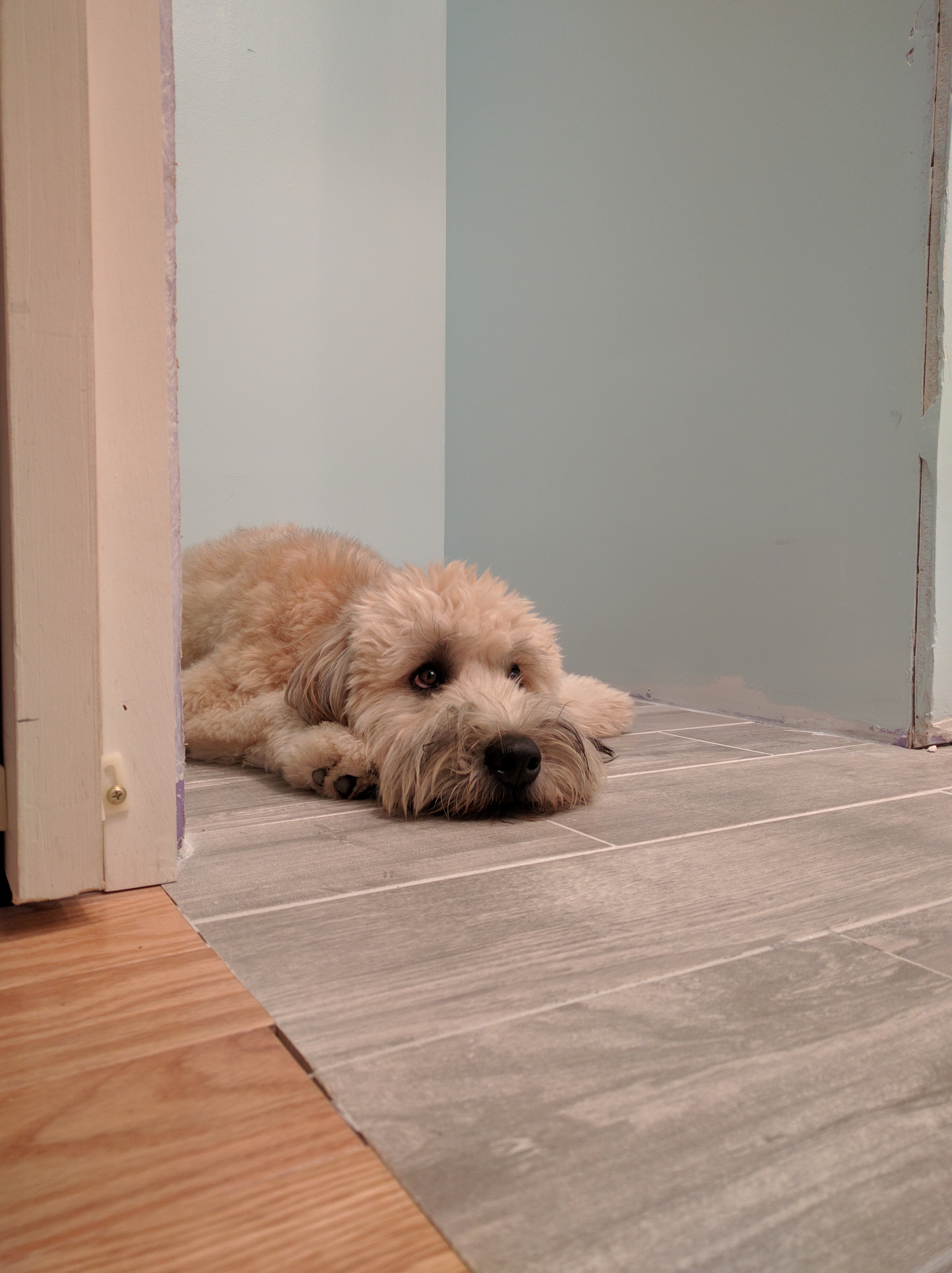 I was a tad sad to lose natural light but our GC added enough lights that it really hasn’t been an issue. We put in a bigger vanity so that both Mike and I can get ready at the same time - lots of storage for all the stuff we have. So far it’s been a success! Plenty of room for both of us, and Thambi can wander in too if he likes.