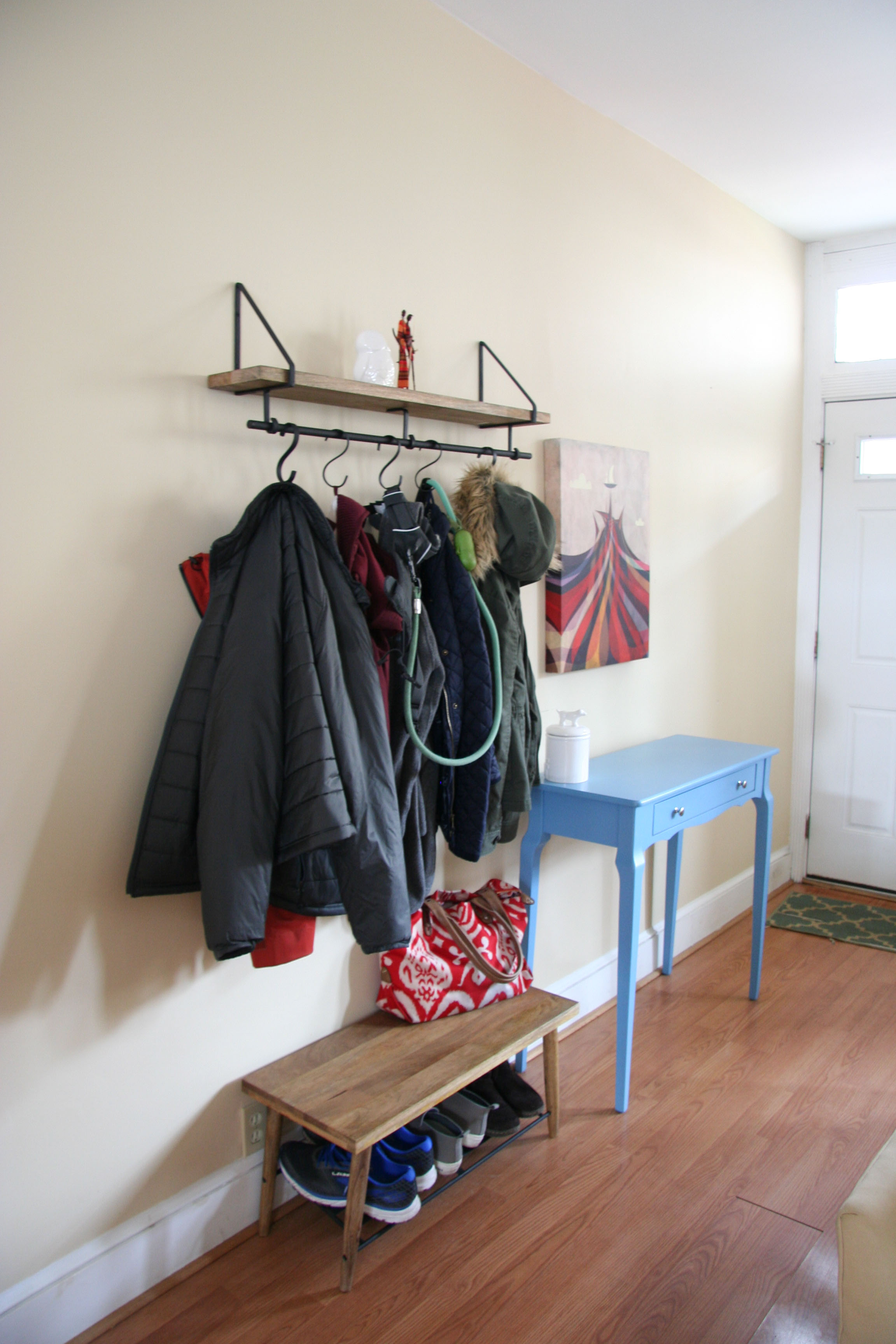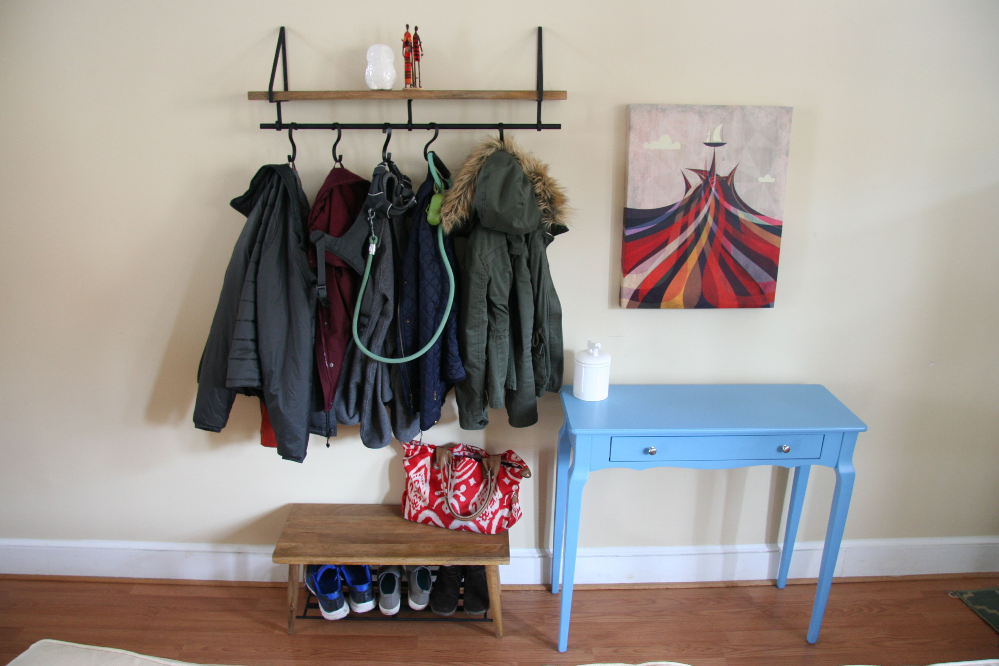 But the coat tree would fall over from the weight of all the coats. It also blocked precious light from the front window. So we decided to get some entry way hooks and a bench from Pottery Barn. Now our entryway looks like this:
