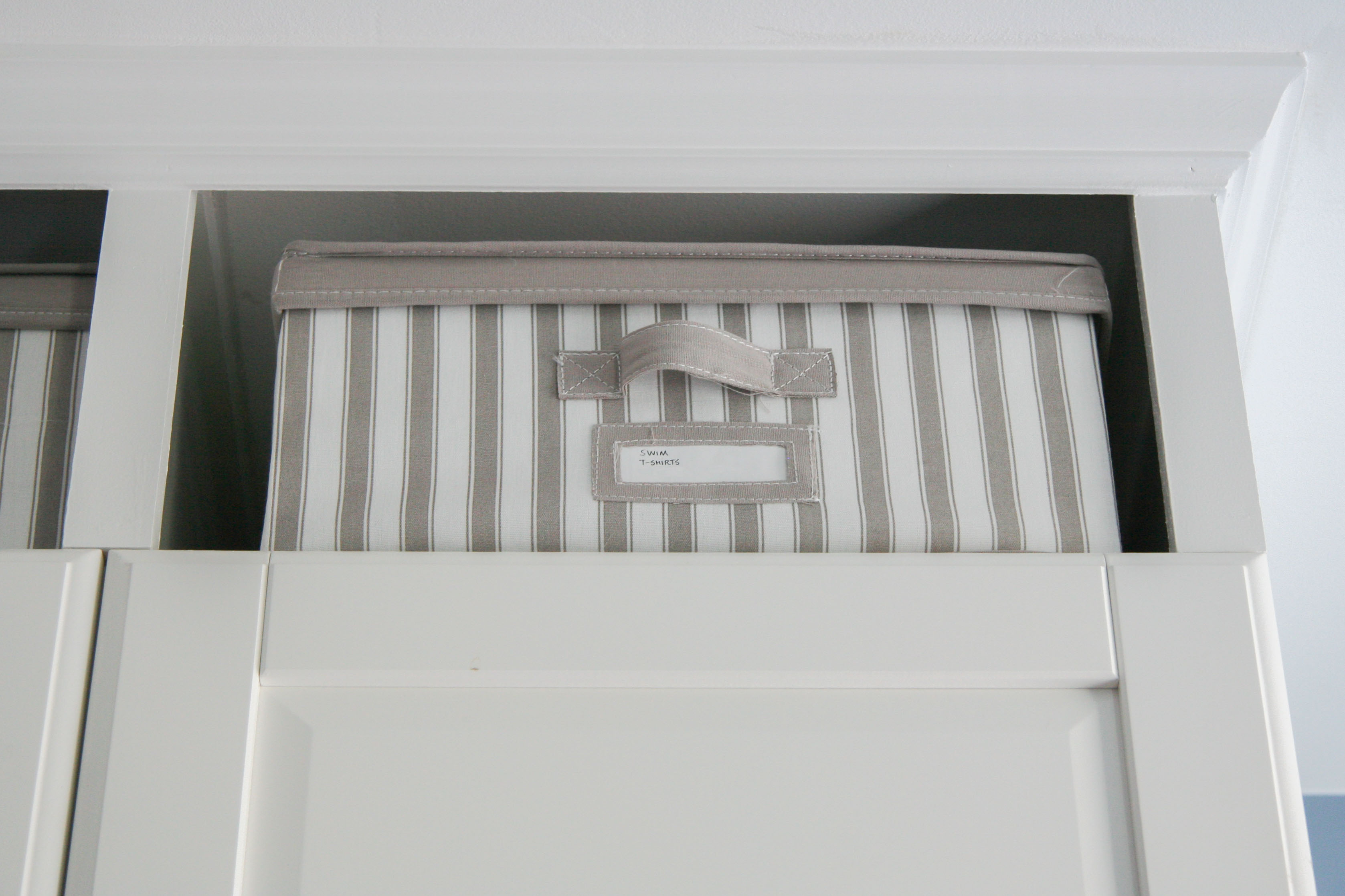 This past March, I went on vacation for a long weekend and when I came back, Mike had finished adding the cubbies at the top of the wardrobe, with nice trim to make the wardrobe look built in. Maybe I should go on vacation more often: