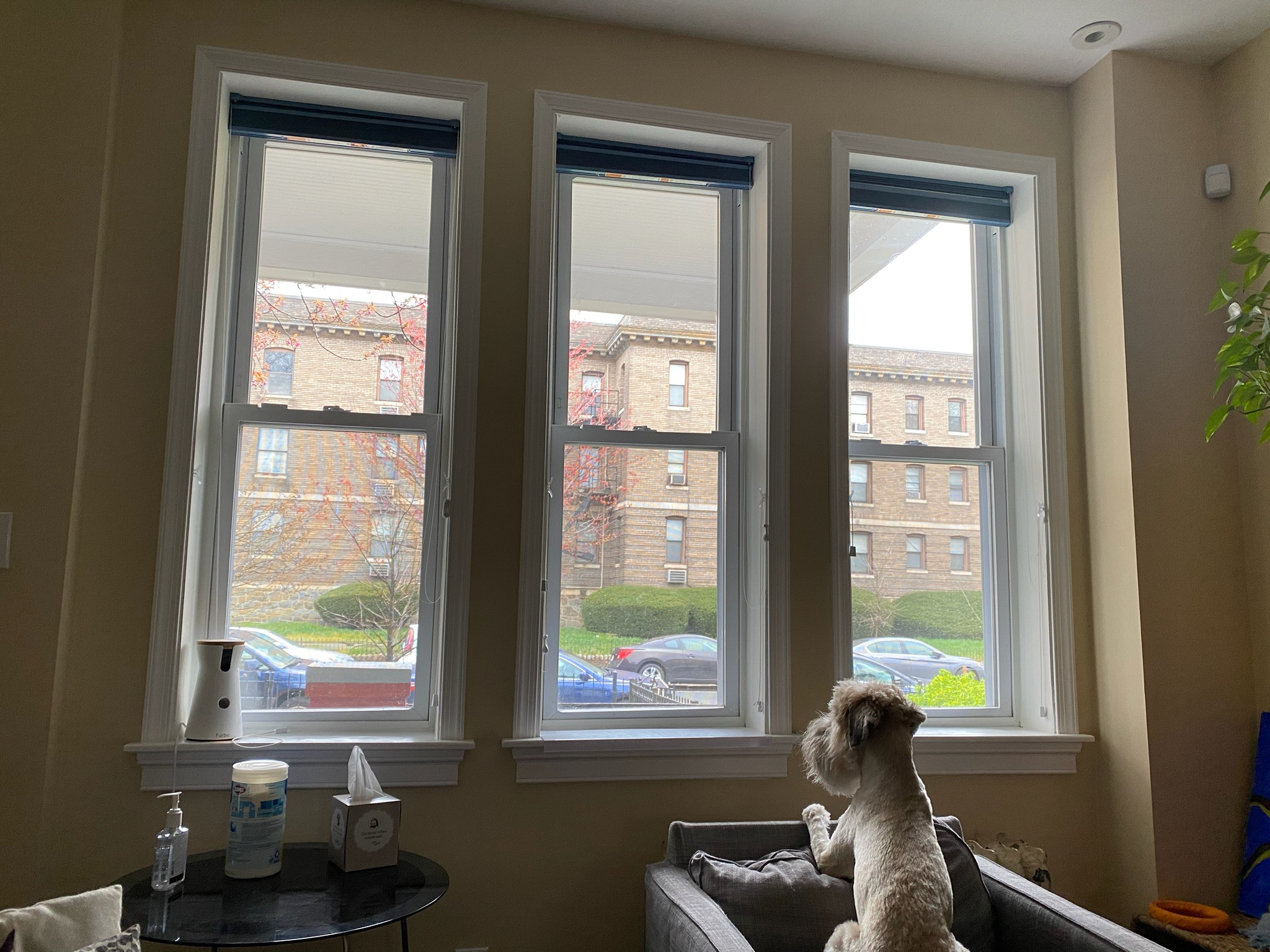 But after some puttying and a couple coats of paint, it was done!!! And what a difference, the windows look much bigger now! Here’s Thambi enjoying his new view and thinking about how that window sill makes it even easier for him to leer at pedestrians on the street. What have we done?!