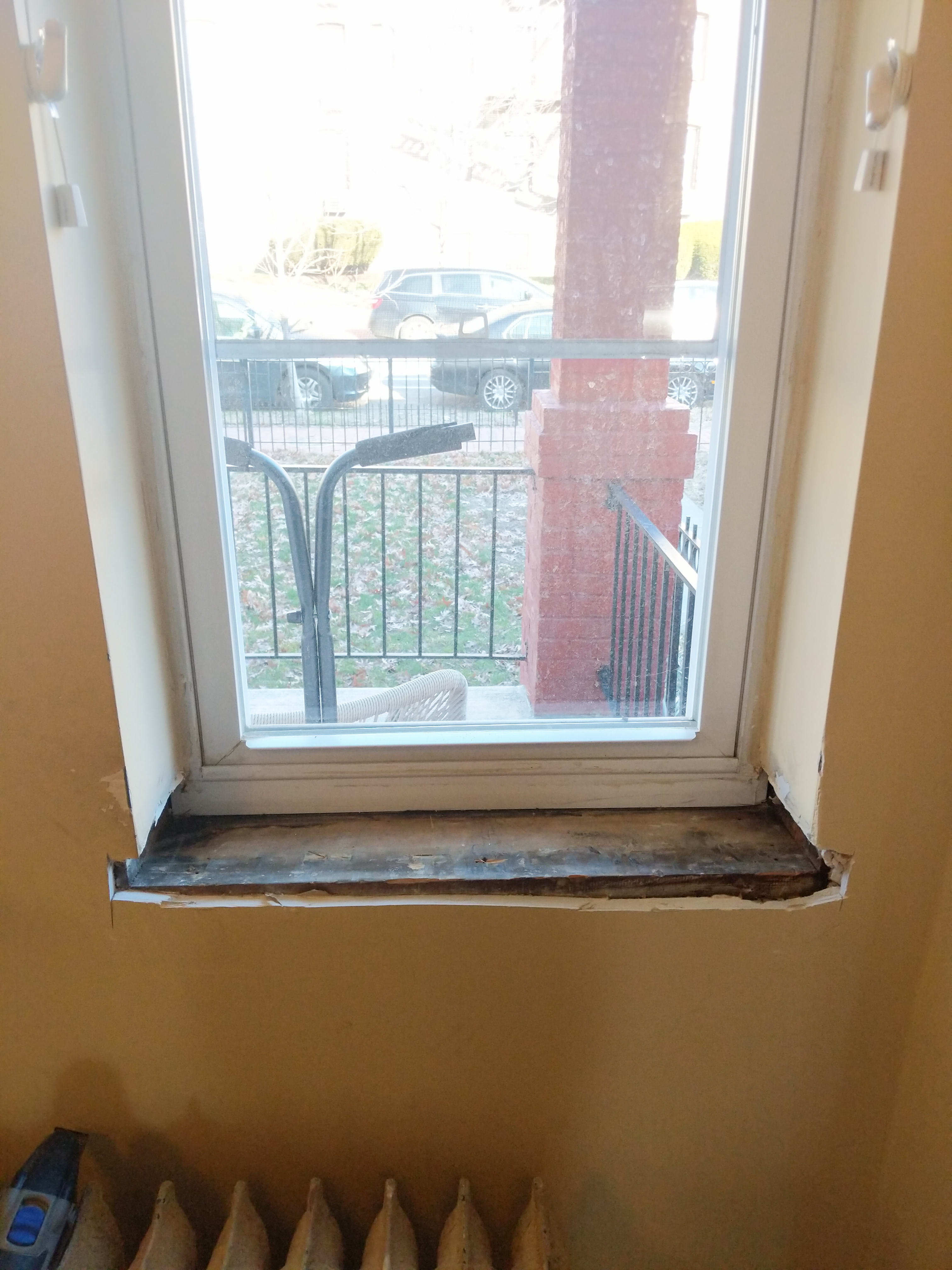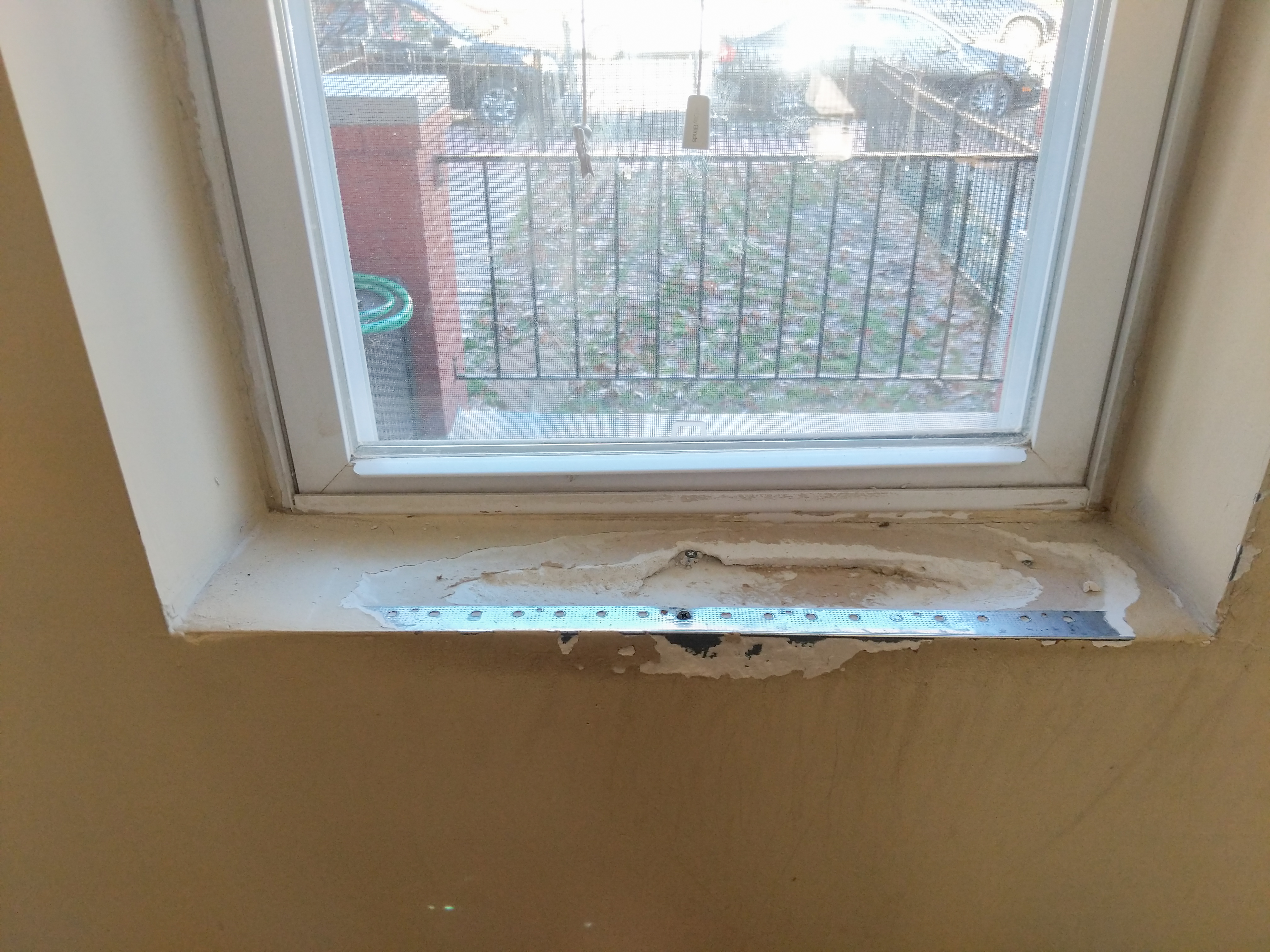 Mike demonstrated how to do the middle window and then I proceeded to tackle the right window all on my own. First, tearing out the drywall so we can make room for a window sill. Wood will be more resistant to furious doggy scratching. That wood there looks hella old!