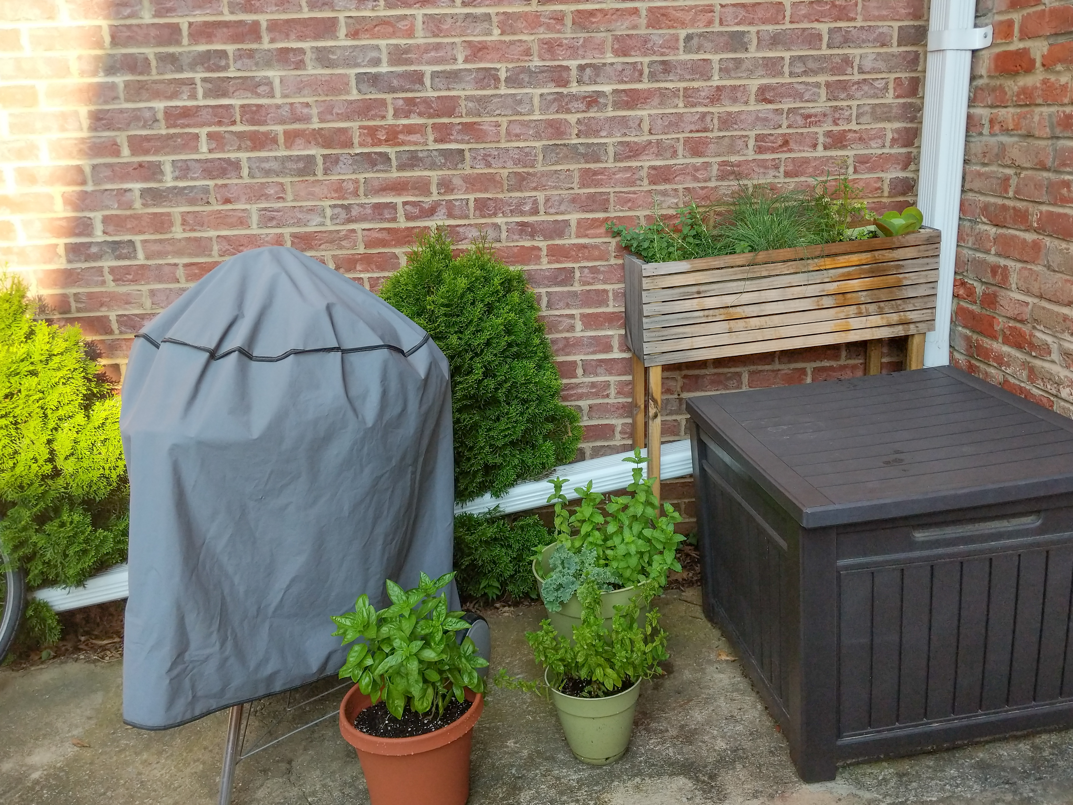 Happy Fall, folks! When the weather finally warmed up this year, I used it as an opportunity to make our back patio a more comfortable place to lounge, particularly since we are pretty much home all the time. I also wanted to incorporate more plants since the brick and concrete make it feel a bit institutional. I didn’t take a before picture but this pic from 2018 is roughly close to what it used to look like. Look how small Thambi looks!