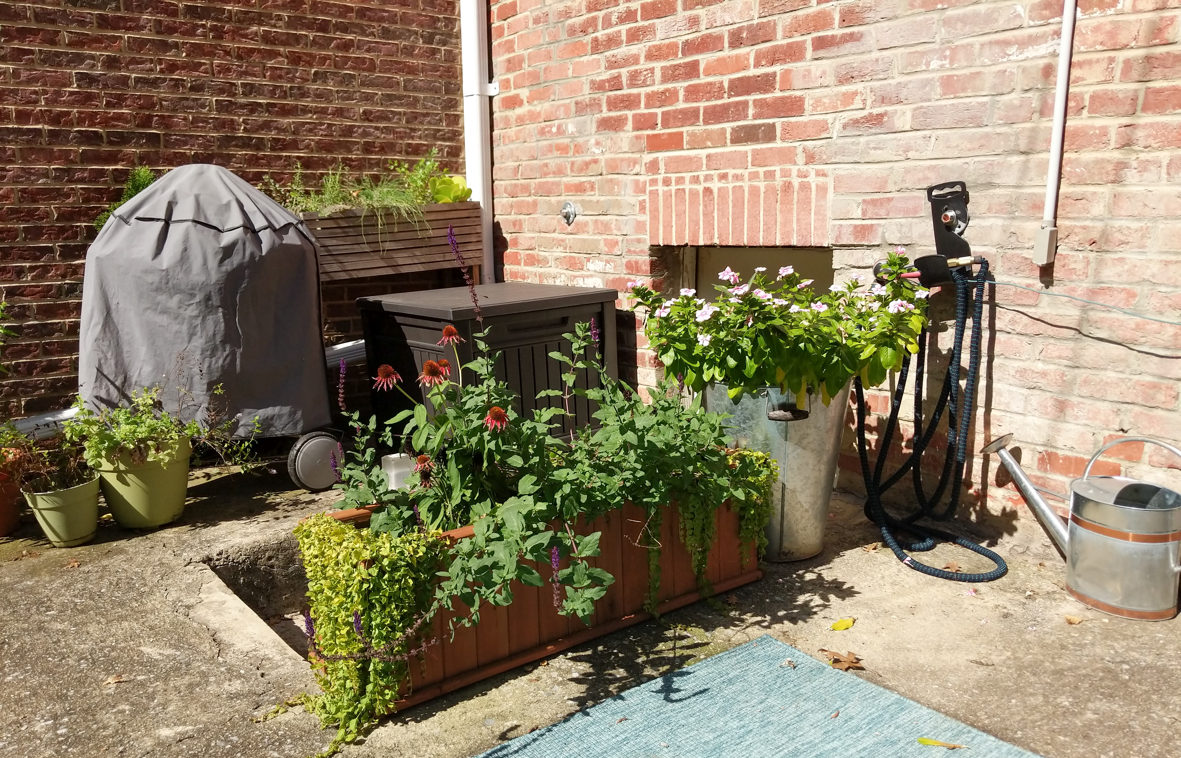 We then put this low horizontal planter by the stairs to the basement (which also helps us block small children from falling down into the stairwell). This cedar planter also came from Wayfair (boy, I spent some $$$ there this summer!):