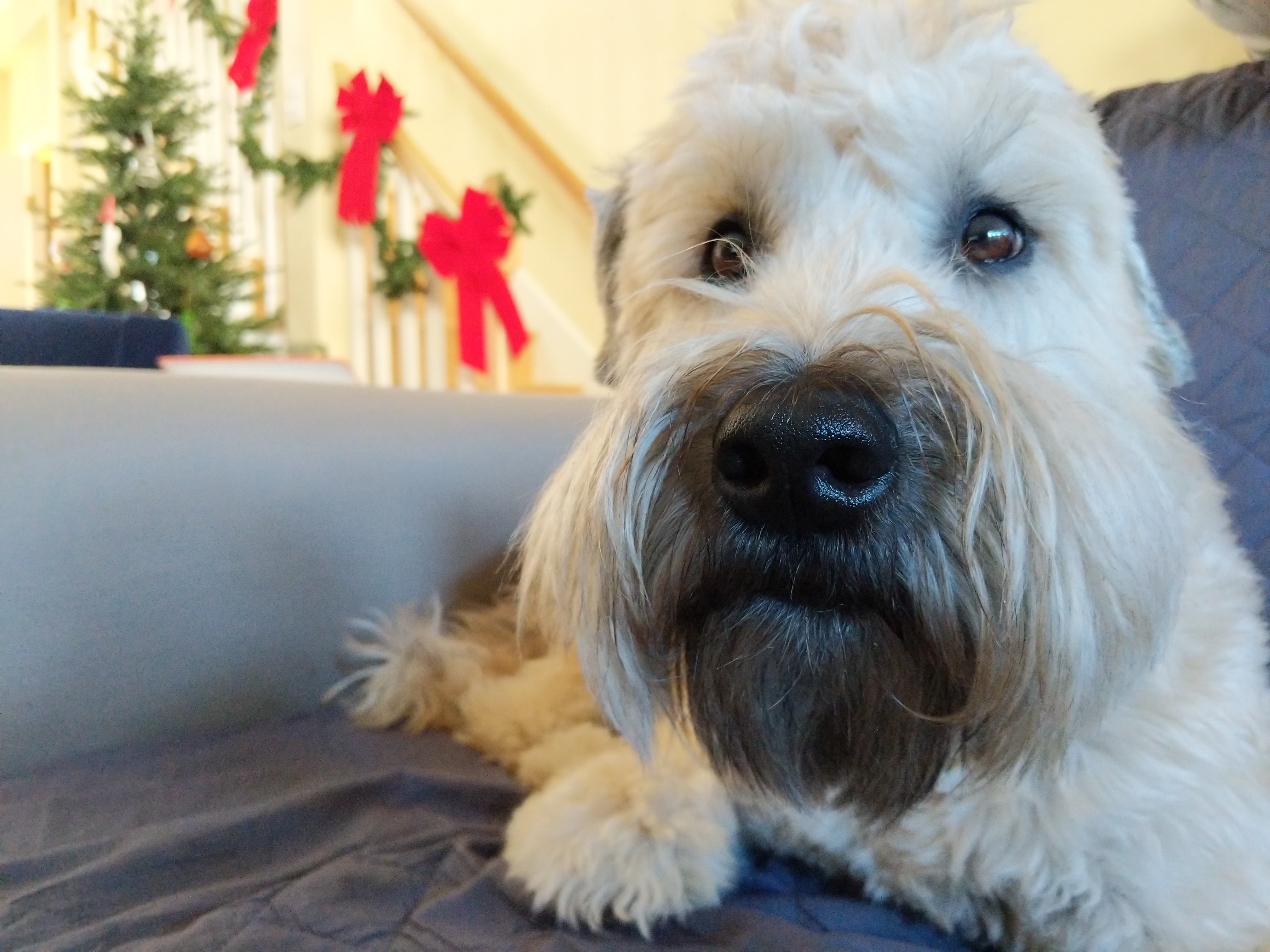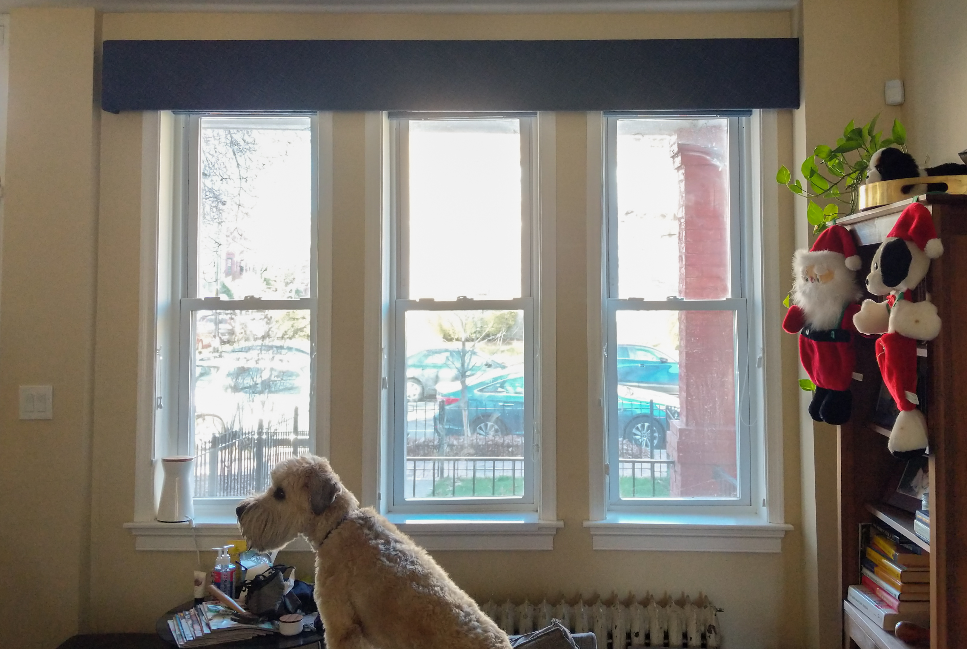 Thambi was pretty chill during this project. Here’s a picture of him watching us mount the cornice, with our new Christmas tree and garland in the background. Happy Holidays to all!