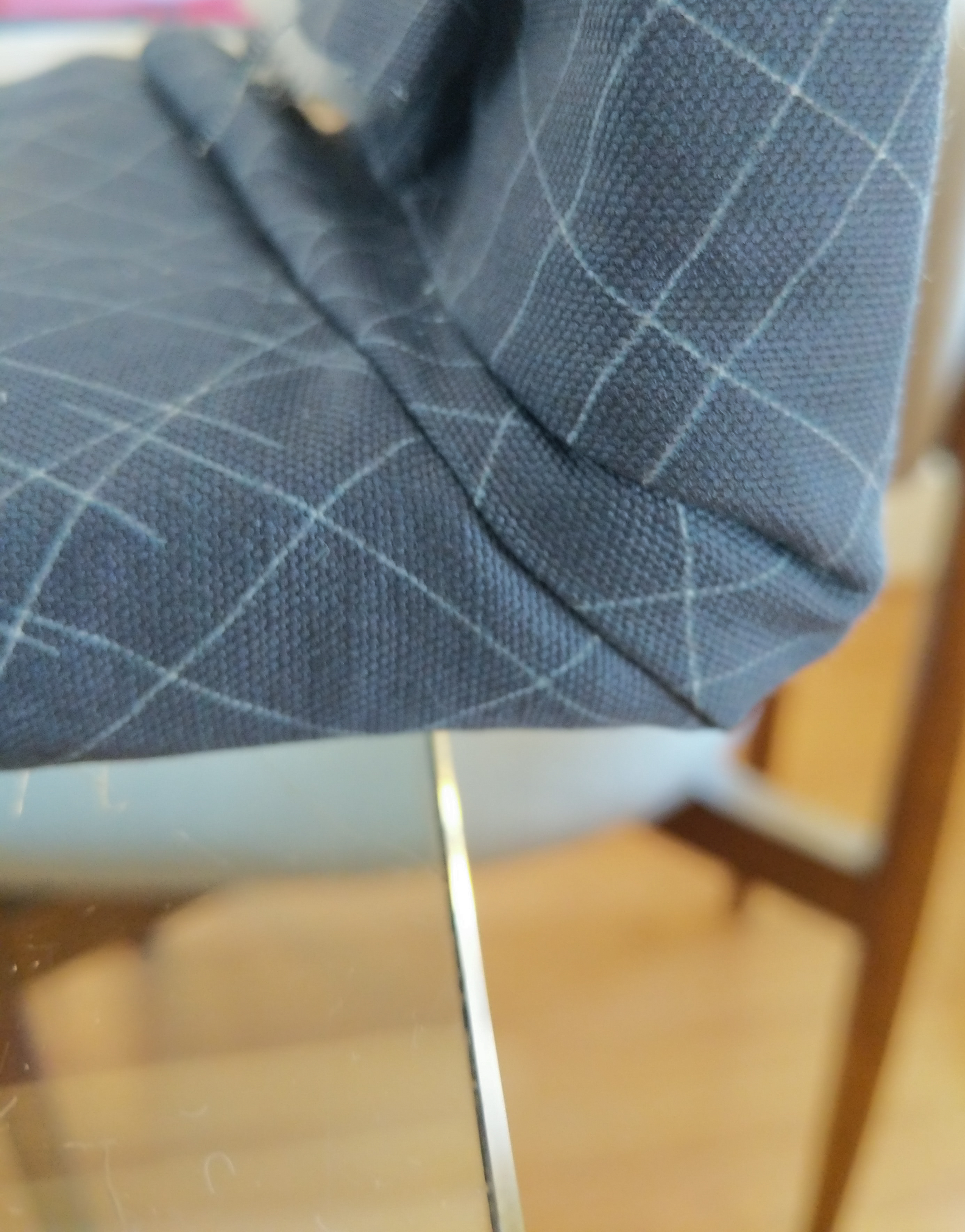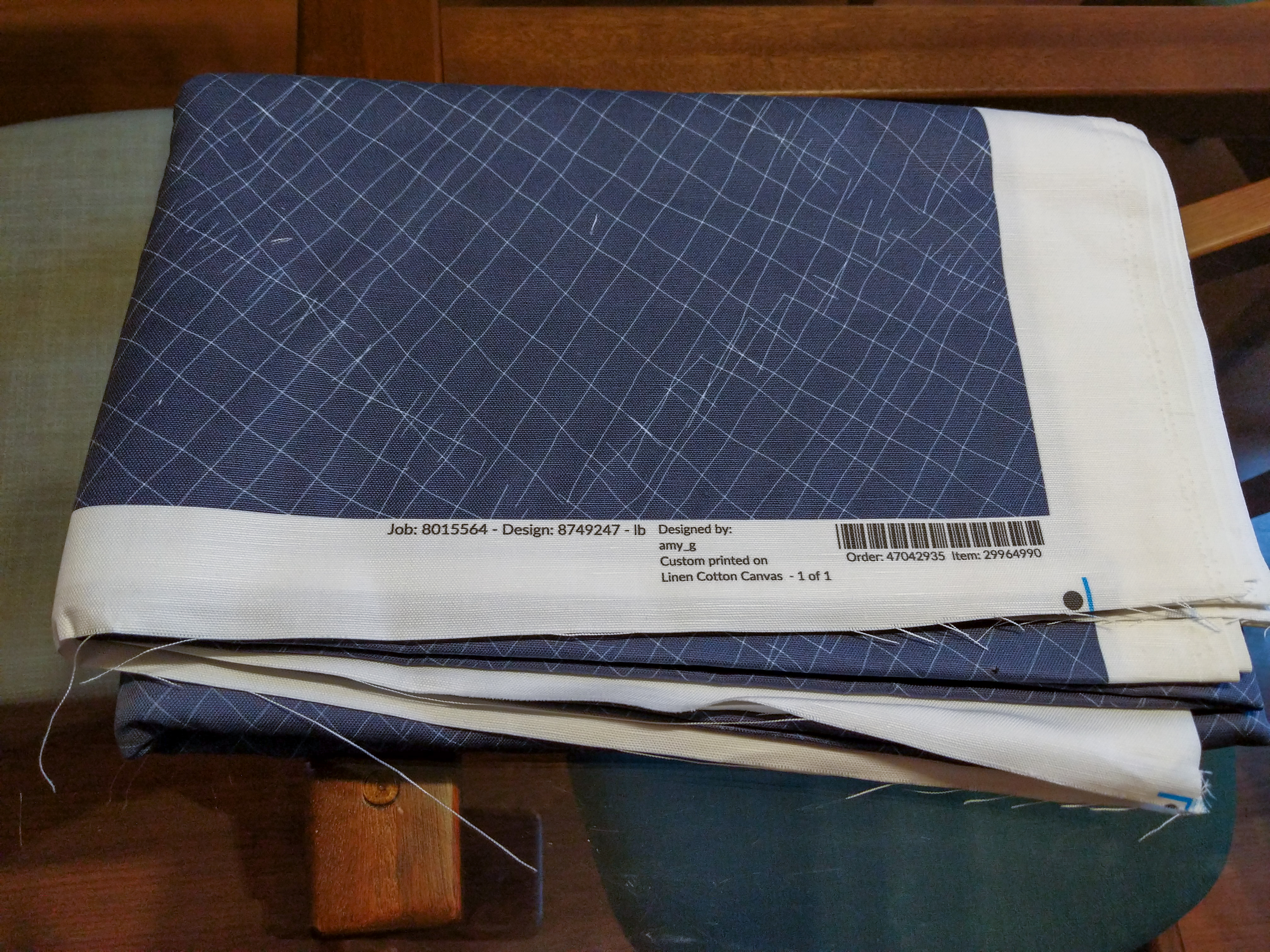 After getting several fabric swatches, I settled on this vaguely geometric pattern from Spoonflower. This roughly mirrors the geometric pattern in our living room rug. You may recall that we used Spoonflower removable wallpaper for the guest bedroom. I was quite pleased with the quality of the fabric & design .