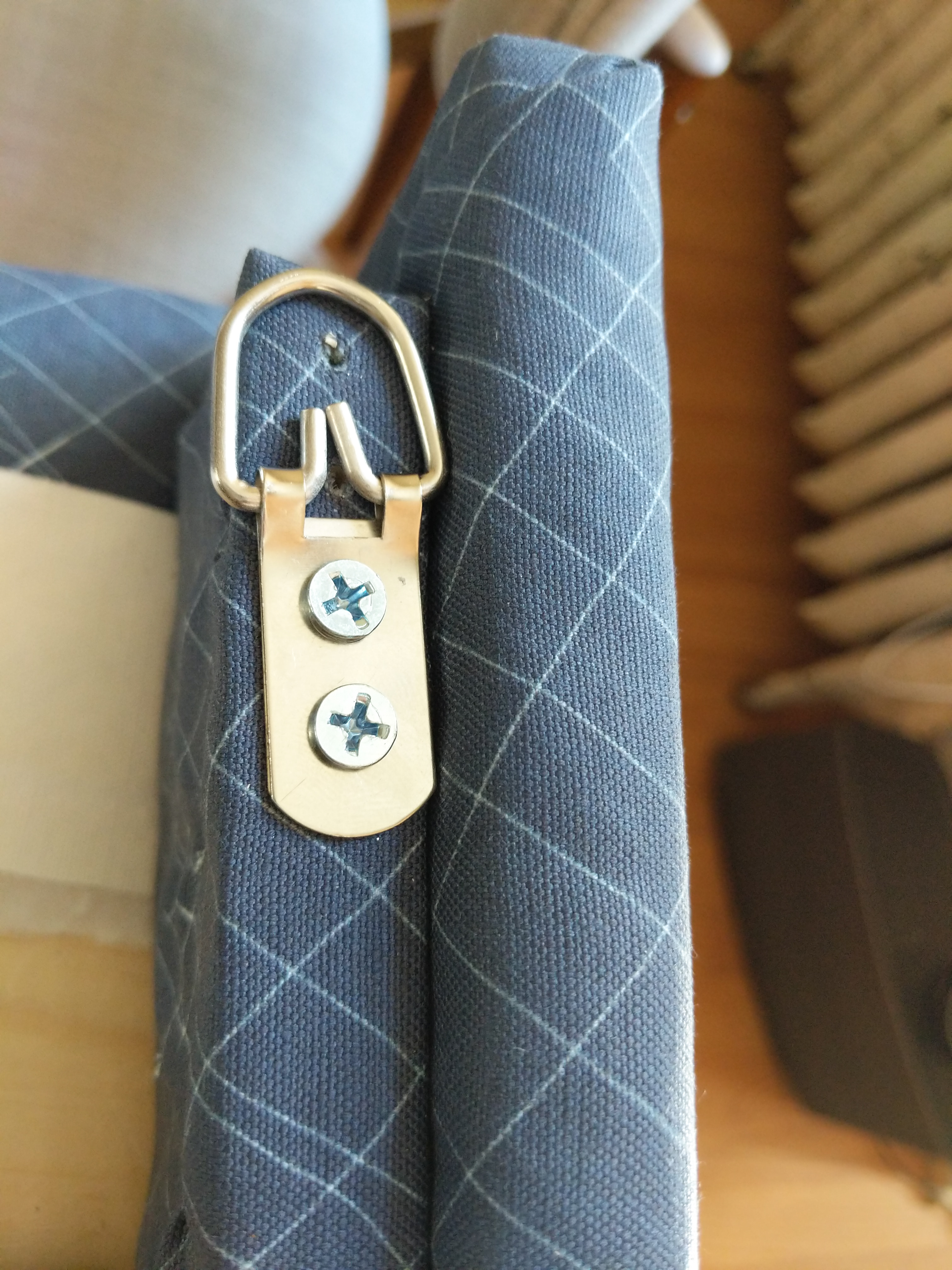 The original post just mounted the wood blocks for the D-rings. We covered them in fabric in case anyone looks up behind the cornice. Then we mounted the D-rings.