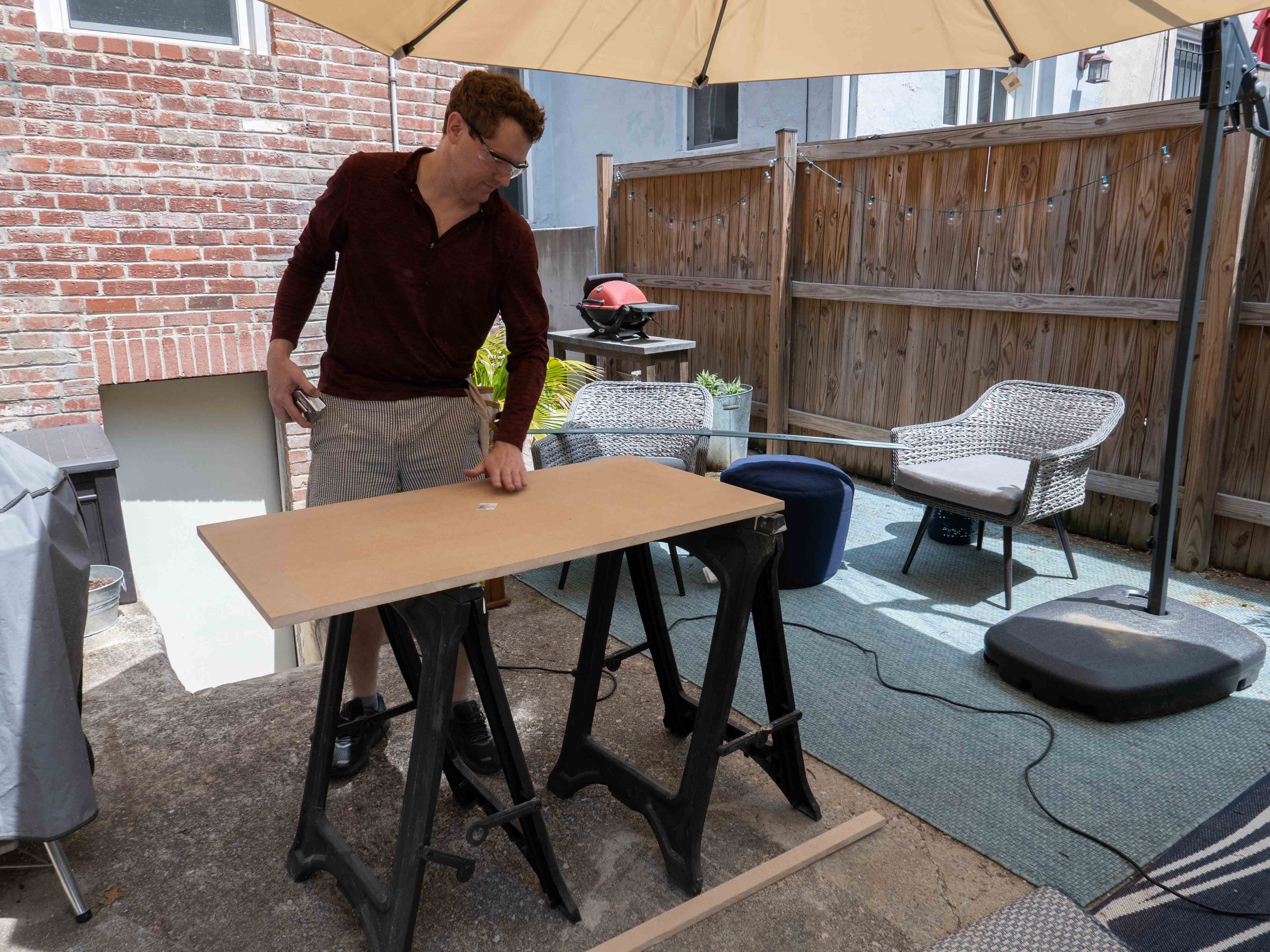 First, we set up shop on the patio and our new cantilevered umbrella was very useful in keeping us cool: