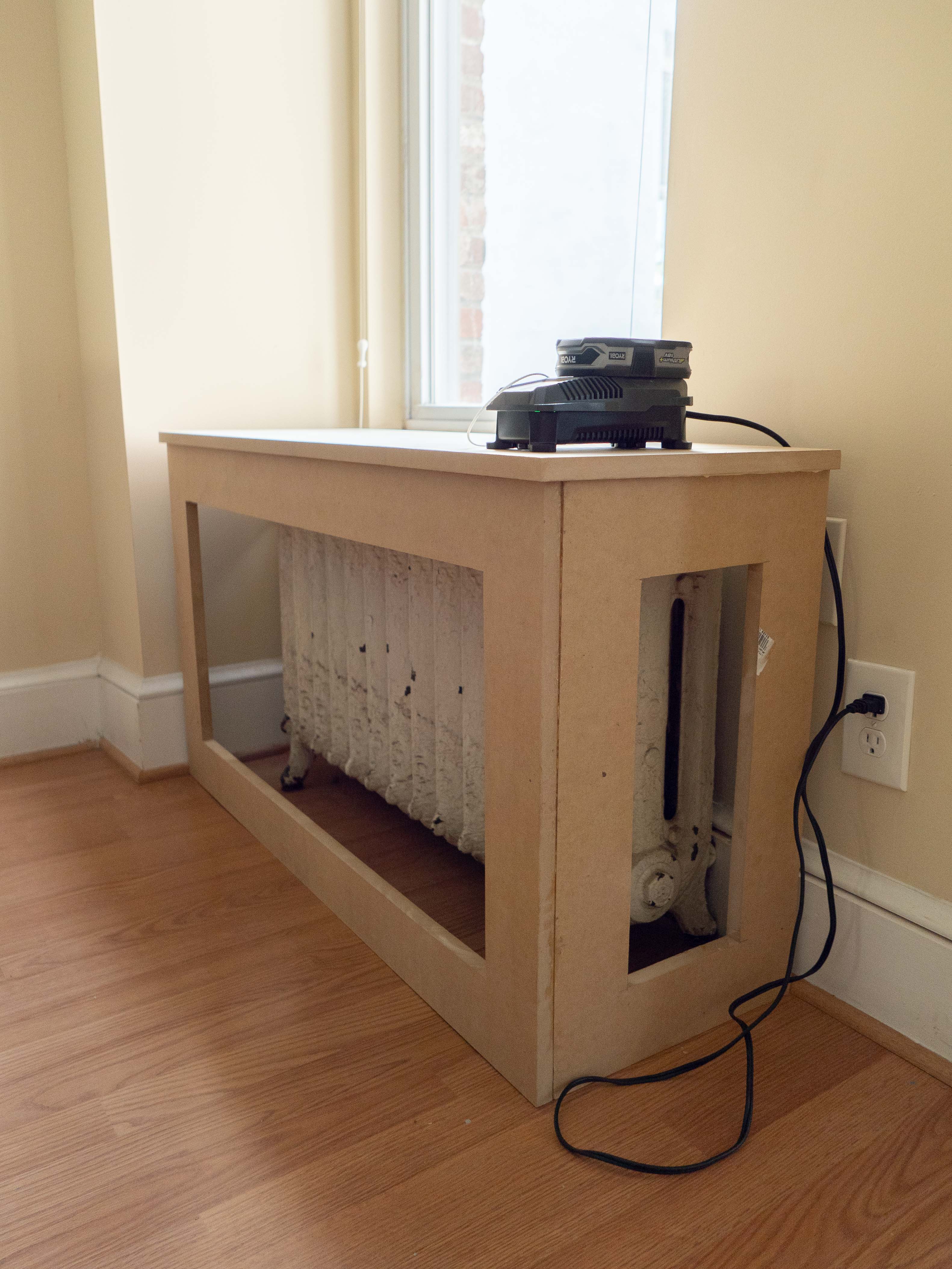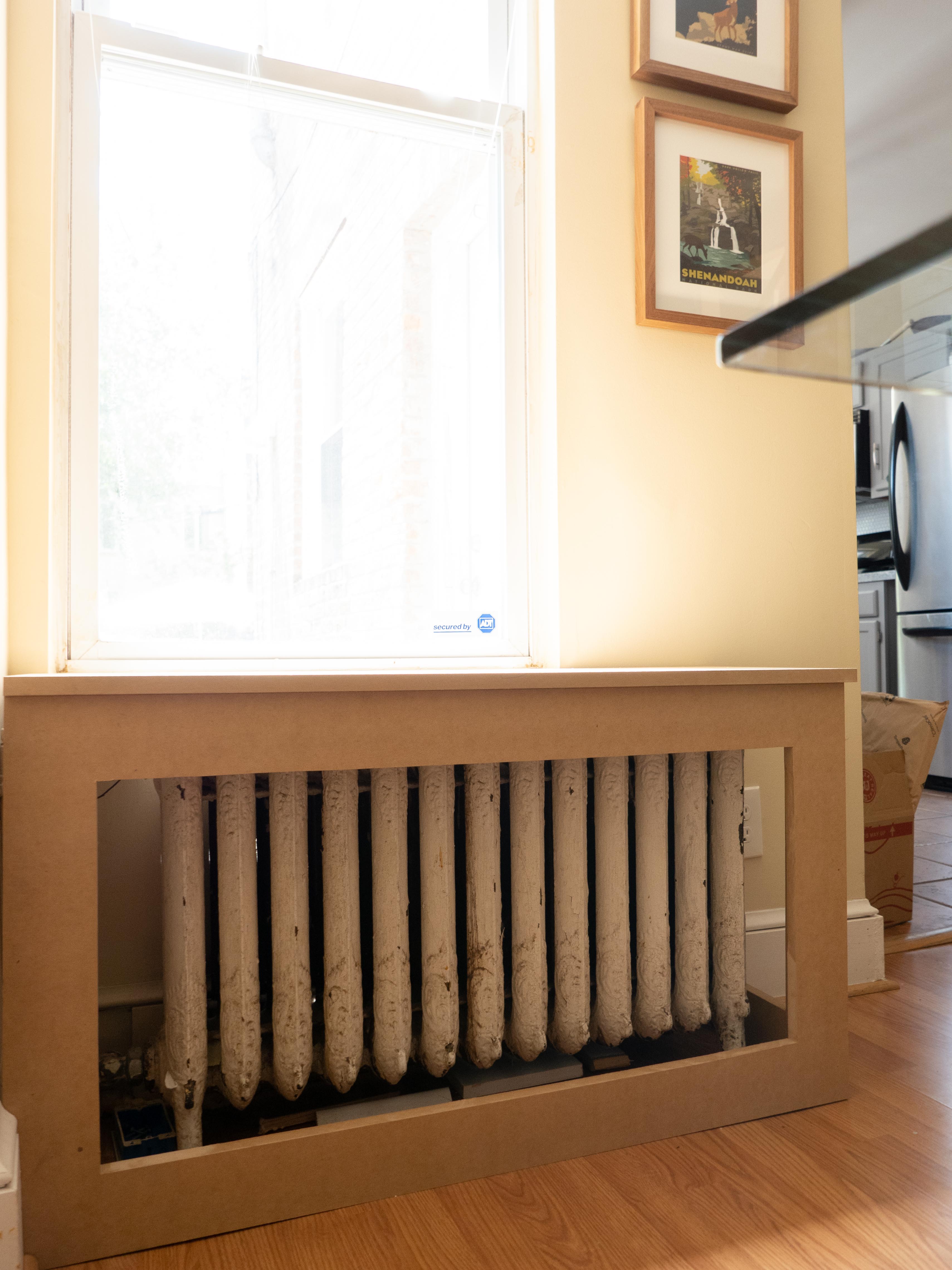 Mike spray painted the metal lattice while I painted the MDF. Both types of paint are heat-tolerant. You can see our really janky radiator in the kitchen, which is also way more visible. I hope we make the radiator cover for this by the end of the year!