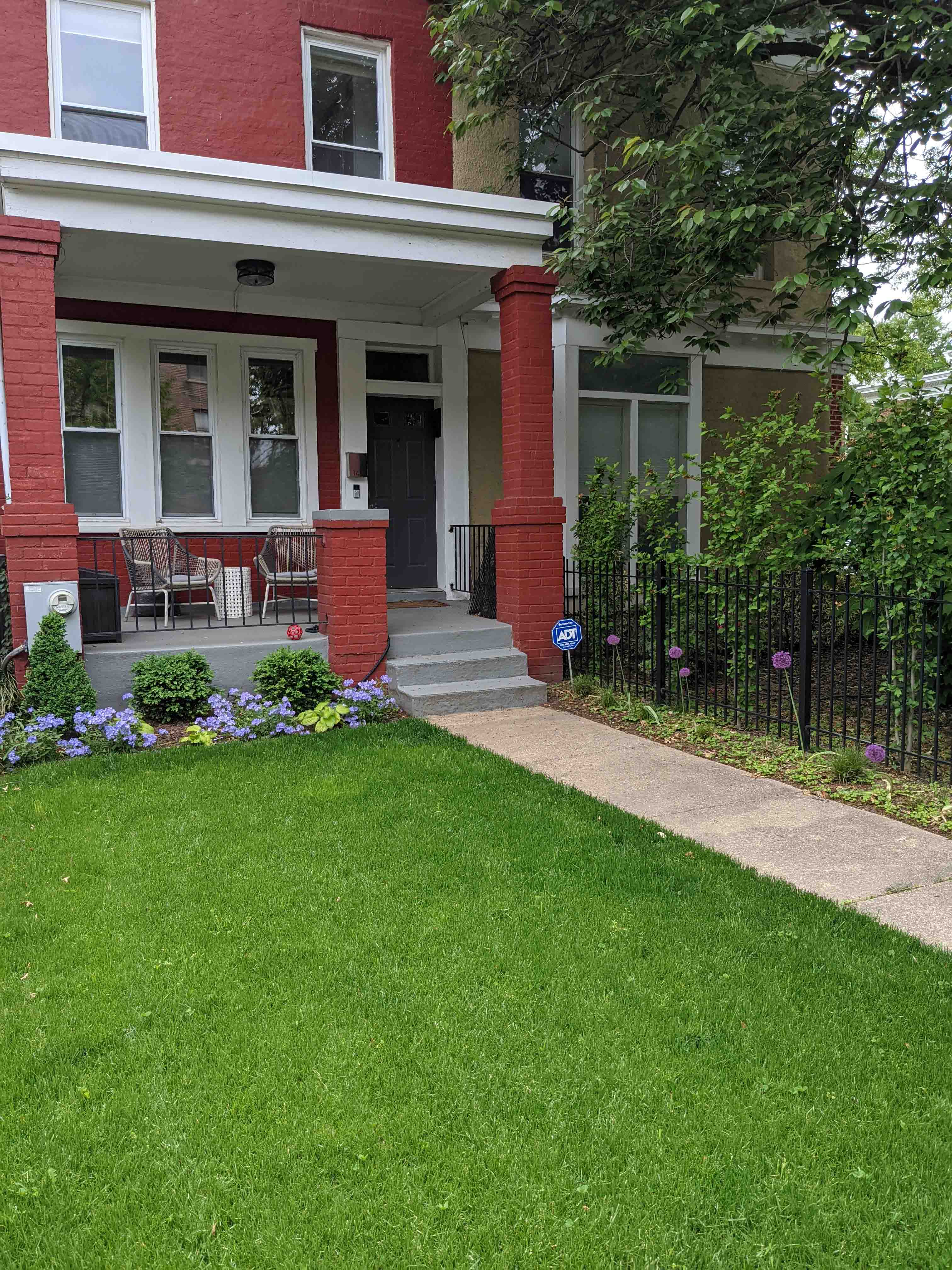 IT WORKED!!! We’re so pleased with the results! The grass looks lush, the plants by the house look great. Even the alliums (the big goofy purple flowers) on the right came up! Since this photo was taken, we have weeded and mulched the right side too so it doesn’t have so many weeds popping up. We actually have gotten quite a number of positive compliments from people passing by on the street.