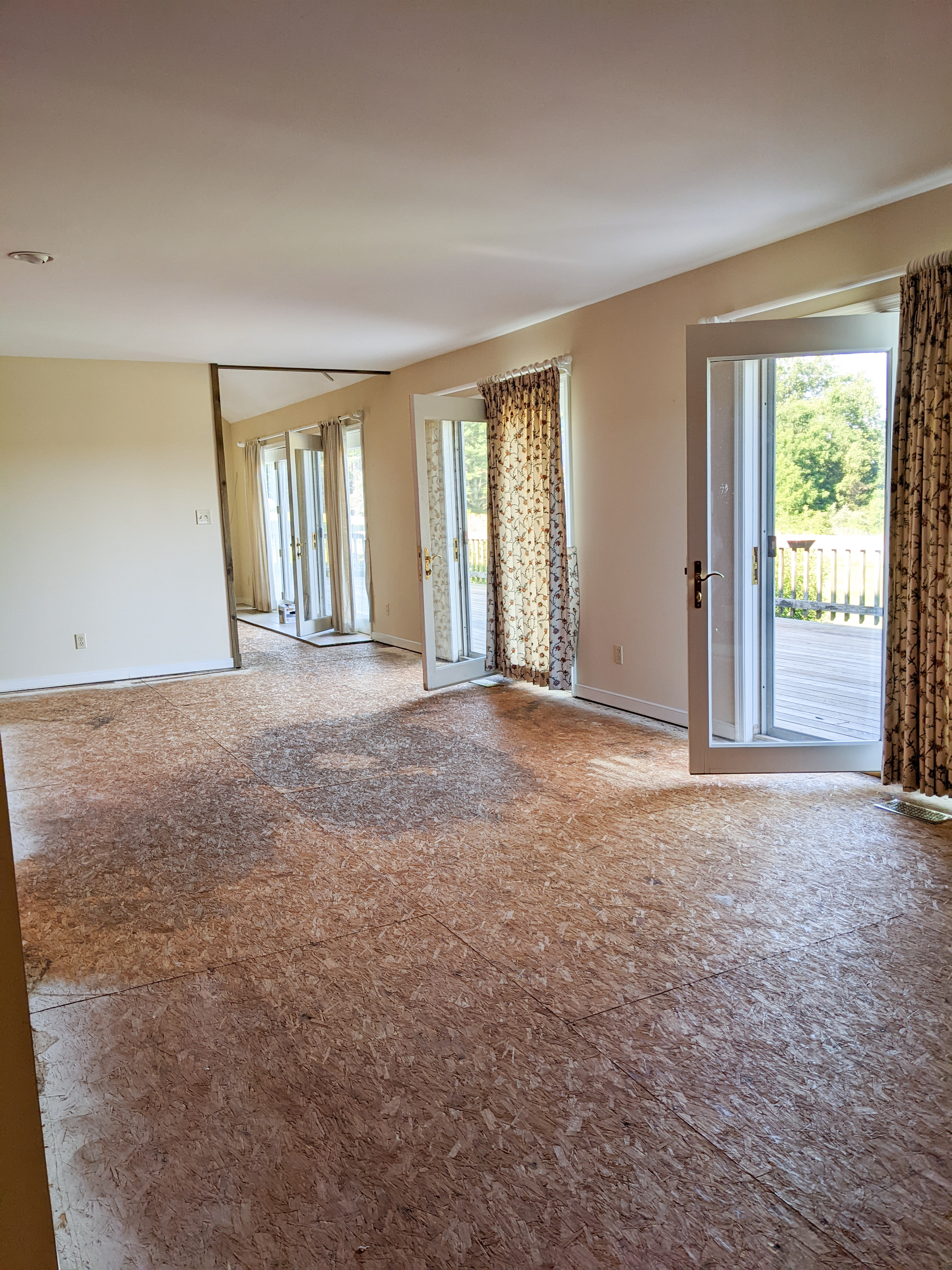 And here is what it looks like sans carpet! The good news is that the subfloor is in decent condition.