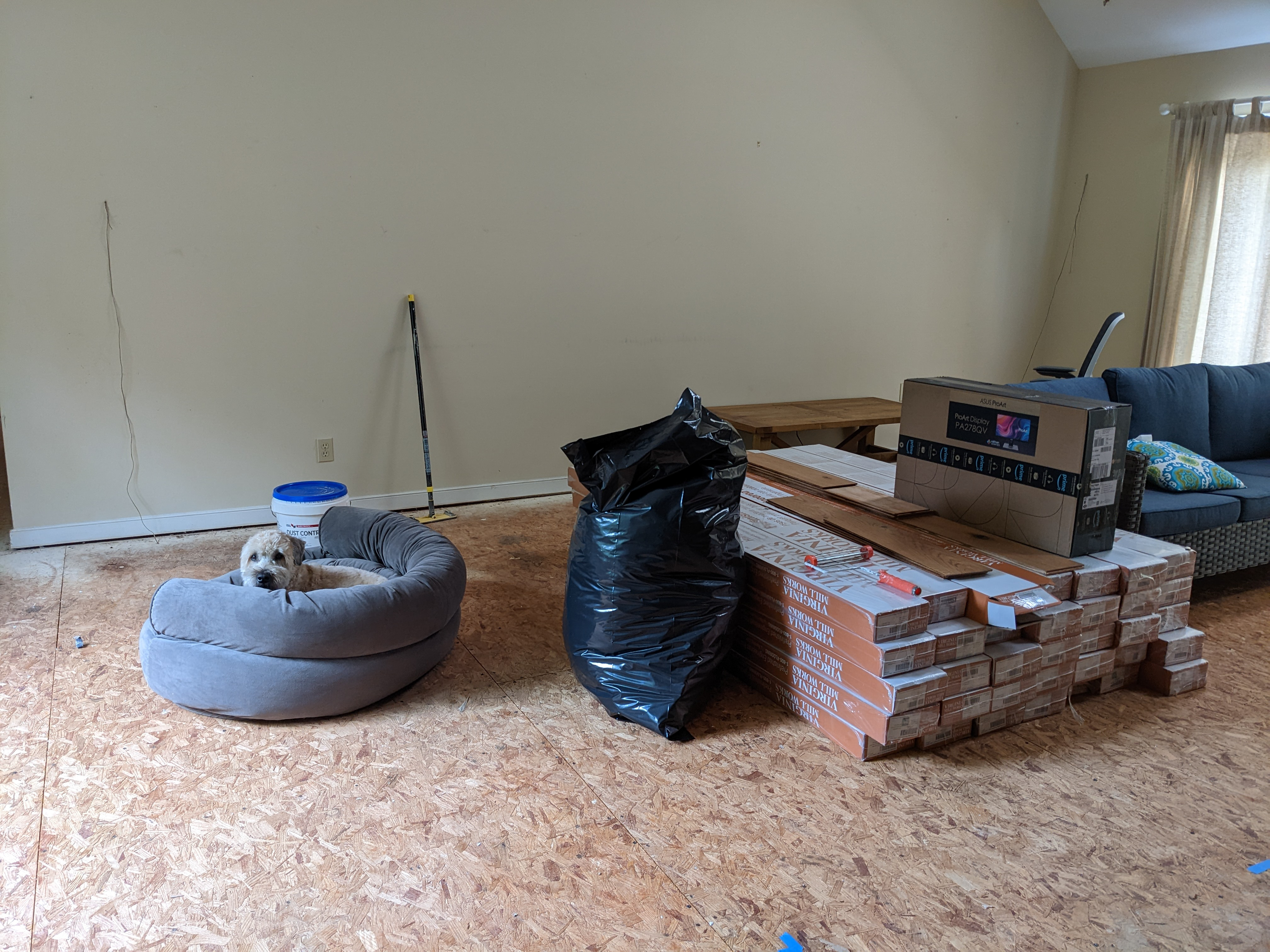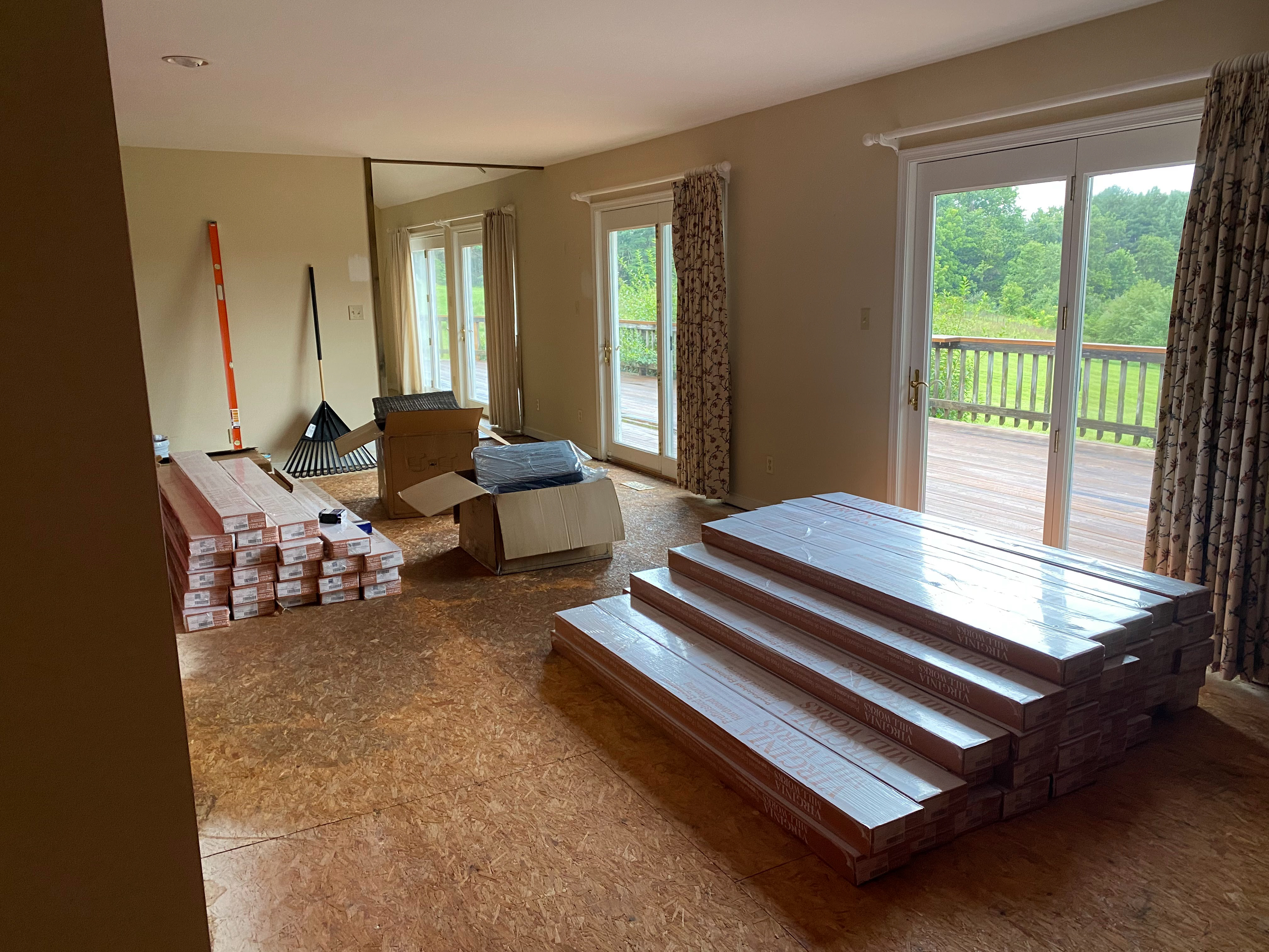 We actually had to pause taking up carpet for several weeks after this because we didn’t have a dumpster. But we didn’t have to wait too long for floors to be delivered. We had picked out some options before we closed so they arrived just a month or so afterwards. It was A LOT of boxes. This is maybe a quarter of the boxes.