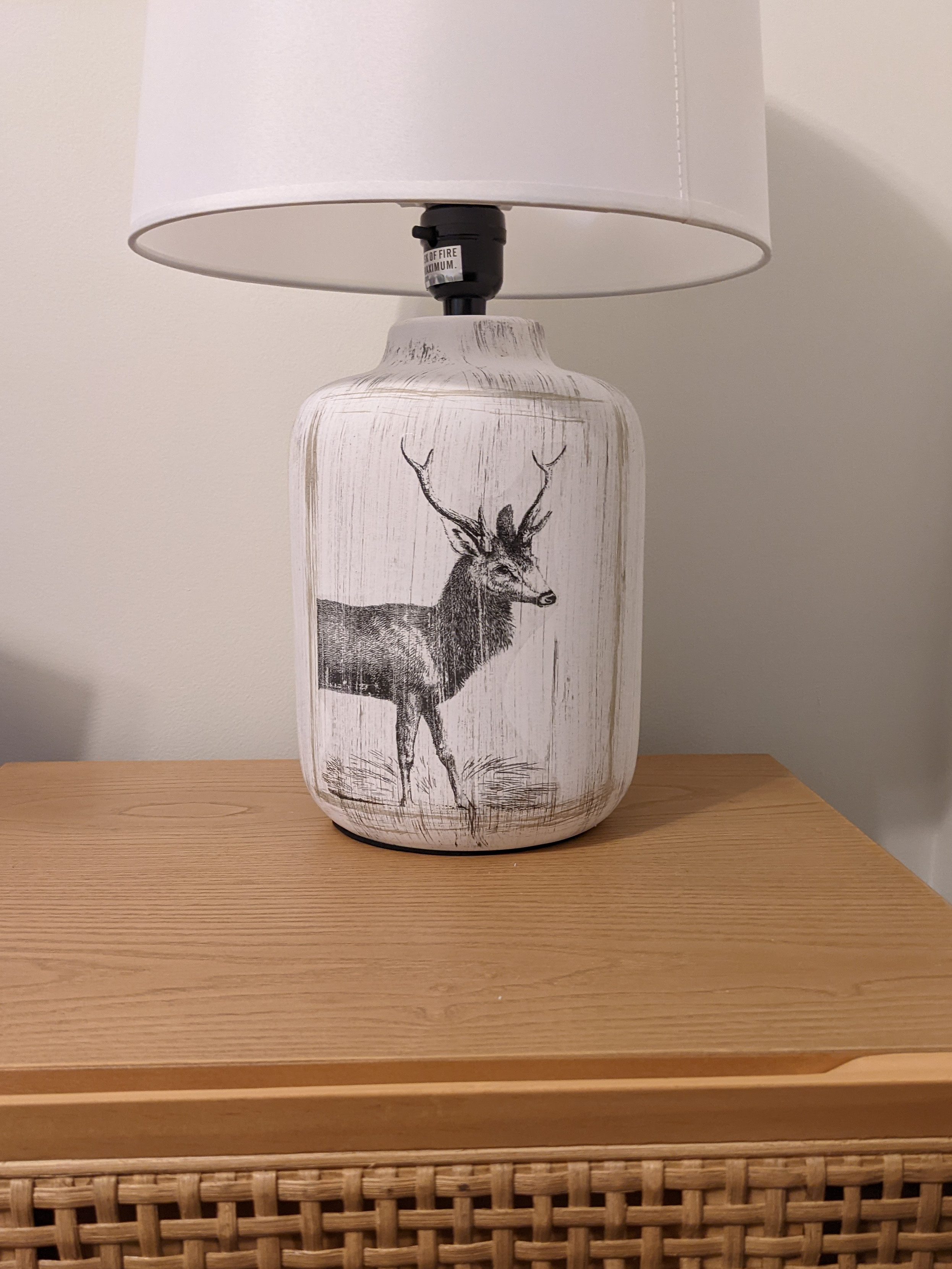 I bought this funky lamp with a deer on it! The nightstand is from Target.