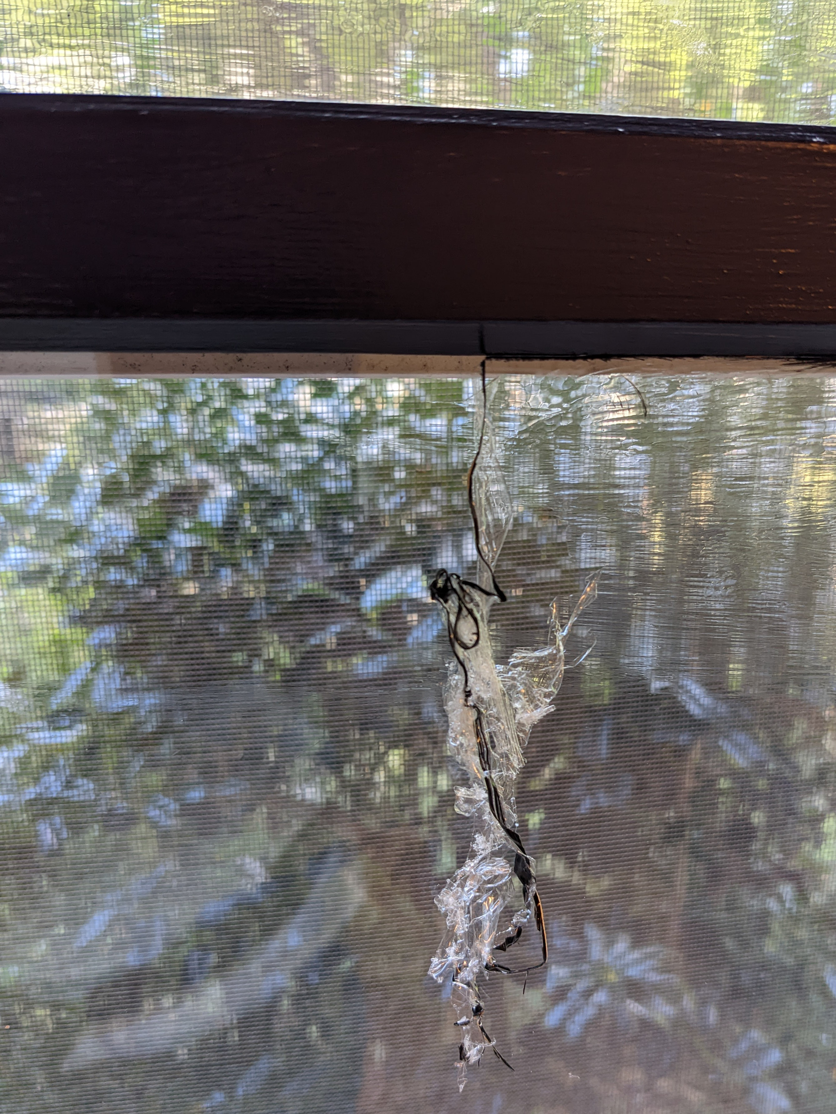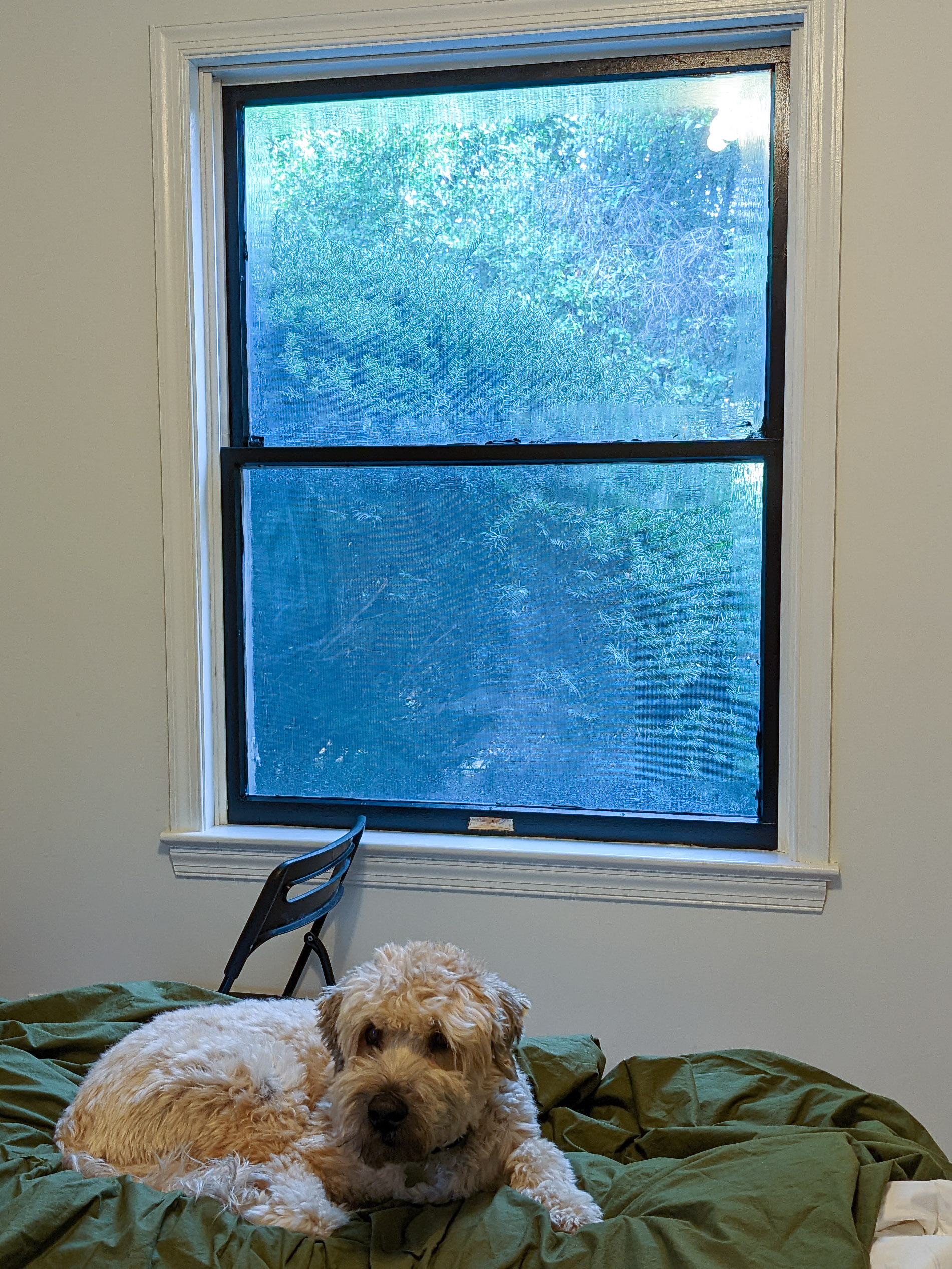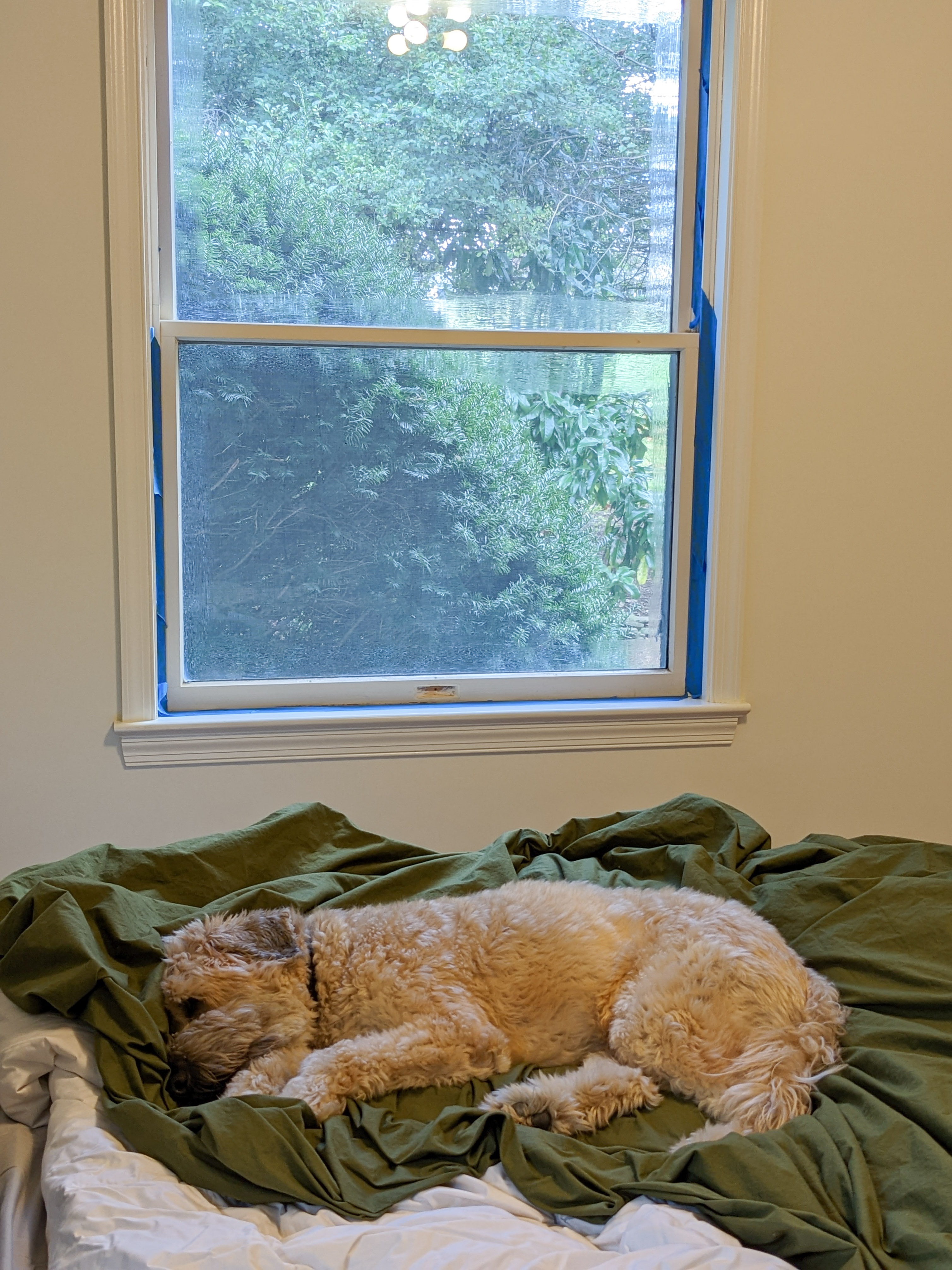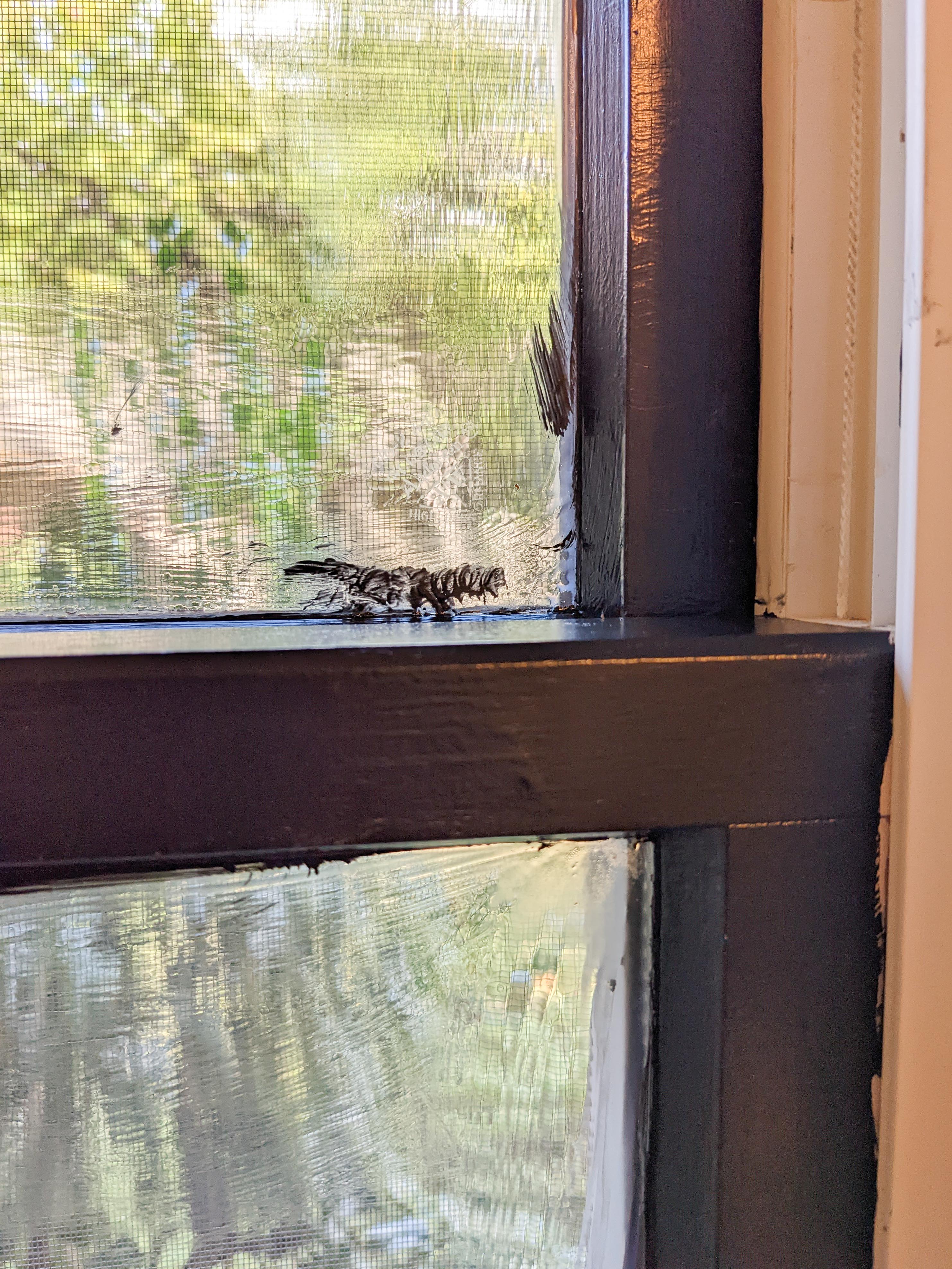 Here’s the second window. You can see I did have to use some tape to protect the rest of the trim. Thambi is using this time to catch a nap.