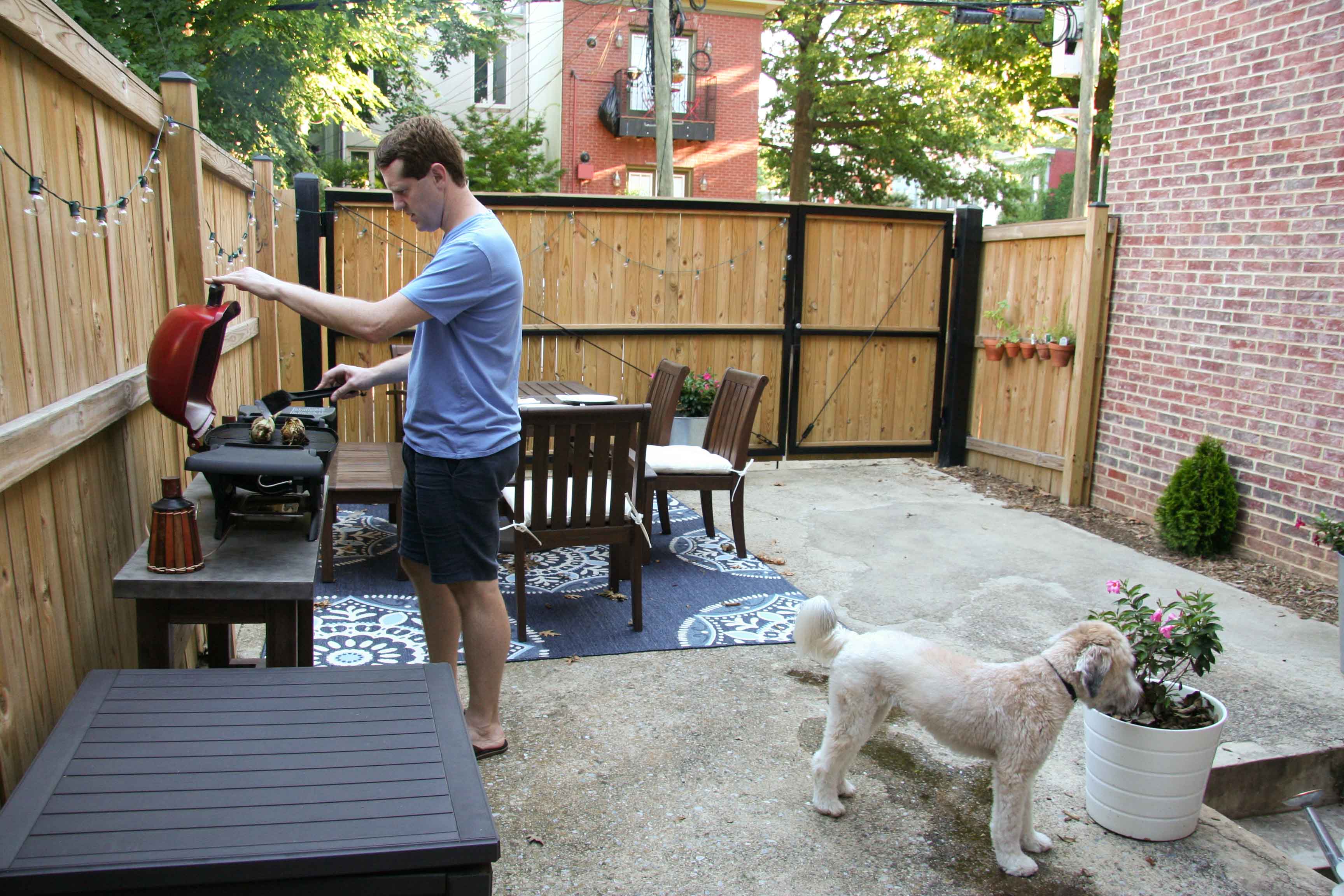 Happy Fall, folks! When the weather finally warmed up this year, I used it as an opportunity to make our back patio a more comfortable place to lounge, particularly since we are pretty much home all the time. I also wanted to incorporate more plants since the brick and concrete make it feel a bit institutional. I didn’t take a before picture but this pic from 2018 is roughly close to what it used to look like. Look how small Thambi looks!